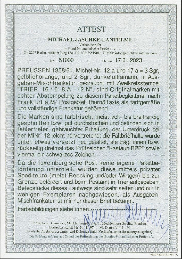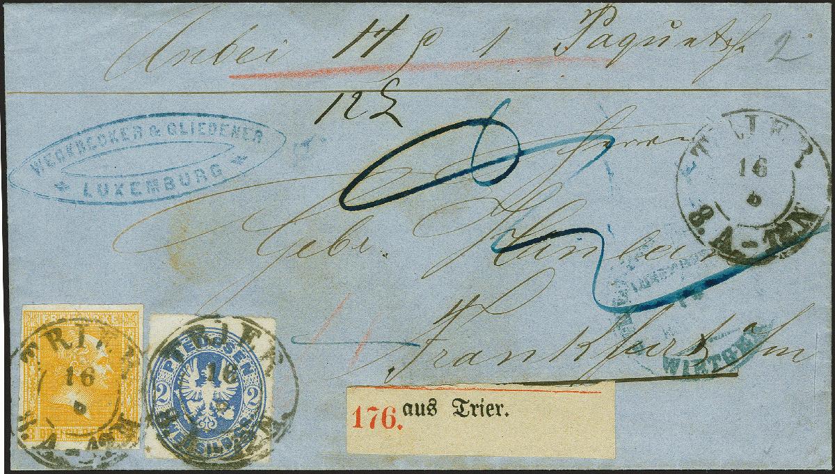 | Zusatzinformationen und Suchstichworte: | 382. Auktion Heinrich Köhler 18. – 23. September 2023 Los 234 Gittergrund 3 Silbergroschen gelblichorange in Mischfrankatur mit Wappen, 2 Silbergroschen dunkelultramarin, beide farbfrisch und voll- bis breitrandig bzw. einwandfrei durchstochen, mit auf- und nebengesetztem Doppelkreisstempel "TRIER 16/6" auf Paketbegleitbrief mit Absenderstempel "WECKBECKER & GLIEDENER, LUXEMBURG" sowie blauem Stempel "Privat-Postexpedition Wirtgen, Luxemburg" als Paketbegleitbrief mit vorderseitigem Paketzettel "aus Trier", nach Frankfurt am Main. Bei der Kopf-Marke der unter Druck minimal hervortretend, sonst einwandfreie Erhaltung. Einzig bekannte Mischfrankatur aus der Bundesfestung und einer von nur wenigen bekannten frankierten Paketbegleitbriefen von dort. Fotoattest Jäschke-L. BPP (2023) Ausruf 5.000,00 EUR |