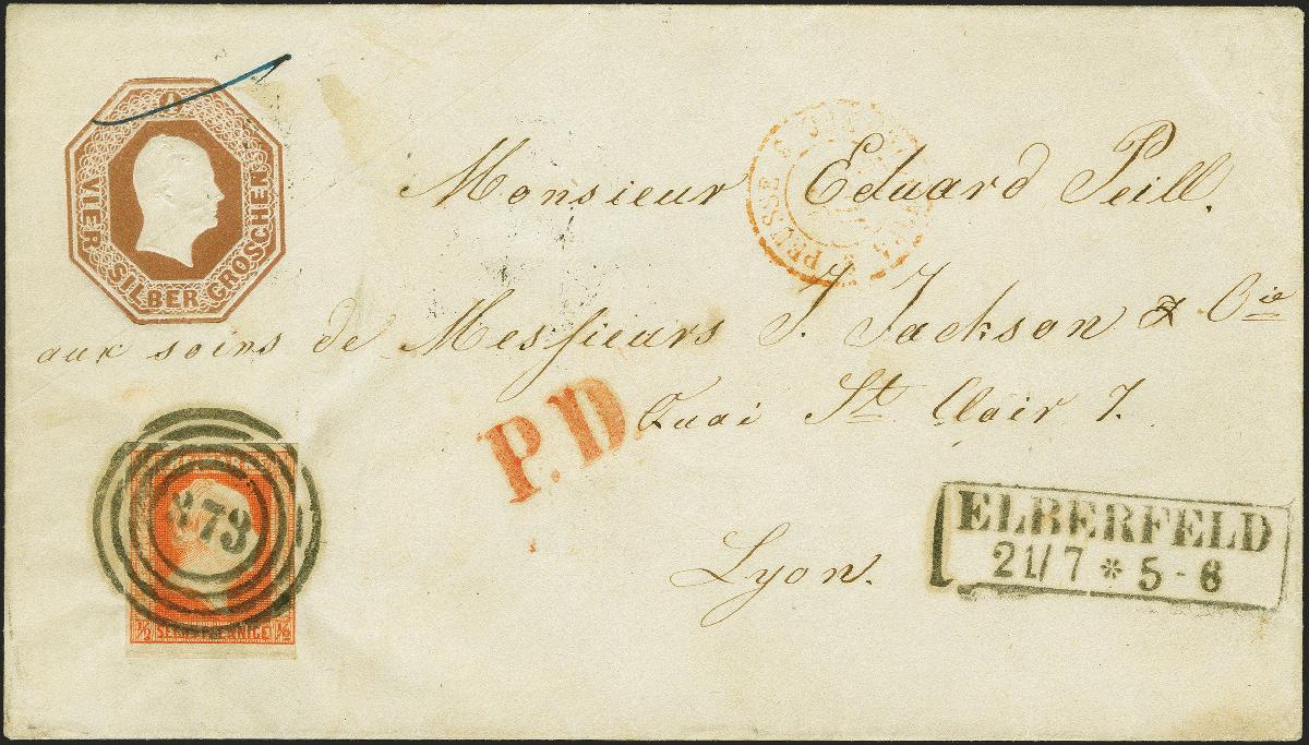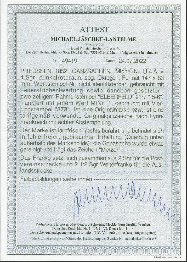 | Zusatzinformationen und Suchstichworte: | 382. Auktion Heinrich Köhler 18. – 23. September 2023 Los 237 1852, Oktogon-Umschlag 4 Silbergroschen rotbraun mit nicht feststellbarer Schilling-Nr., mit Zufrankatur 1850, ½ Silbergroschen rotorange, rechts leicht berührt, sonst voll- bis breitrandig mit klarem Nummernstempel "373" und nebengesetztem Rahmenstempel "ELBERFELD 21/7" (1855) nach Lyon. Im weißen Unterrand der Marke waagerechte Faltspur, sonst einwandfrei und sehr frisch. Ein sehr schönes Stück aus bekannter Korrespondenz. Fotoattest Jäschke-L. BPP (2022) Ausruf 200,00 EUR |