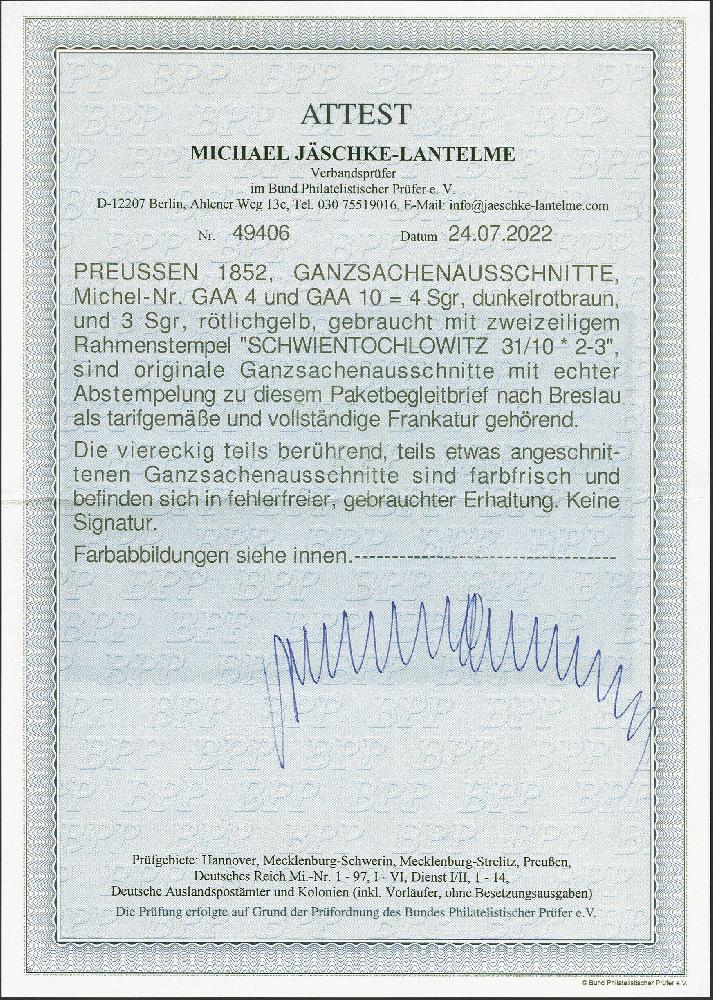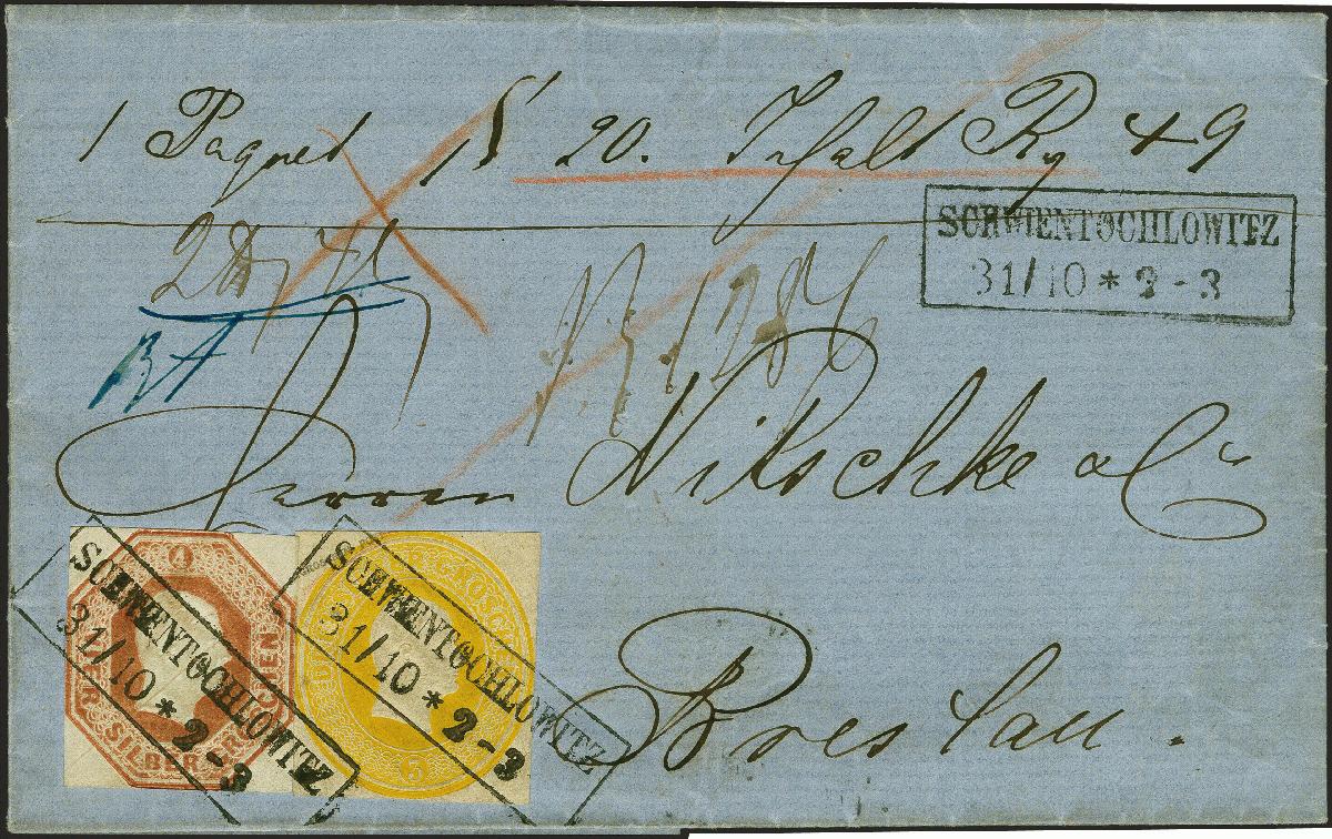 | Zusatzinformationen und Suchstichworte: | 382. Auktion Heinrich Köhler 18. – 23. September 2023 Los 238 Ganzsachenausschnitt 4 Silbergroschen rotbraun in seltener Mischfrankatur mit Ganzsachenausschnitt 1853, 3 Silbergroschen gelb mit grauem Überdruck links, beide viereckig geschnitten, dabei berührt bzw. teils minimal angeschnitten, mit klarem Rahmenstempel "SCHWIENTOCHLOWITZ 31/10" (1860) auf komplettem Paketbegleitbrief mit rückseitigem Paketzettel nach Breslau. Eine ausgesprochen seltene Frankatur Kombination in sonst einwandfreier und frischer Erhaltung. Ausruf 1.000,00 EUR |
