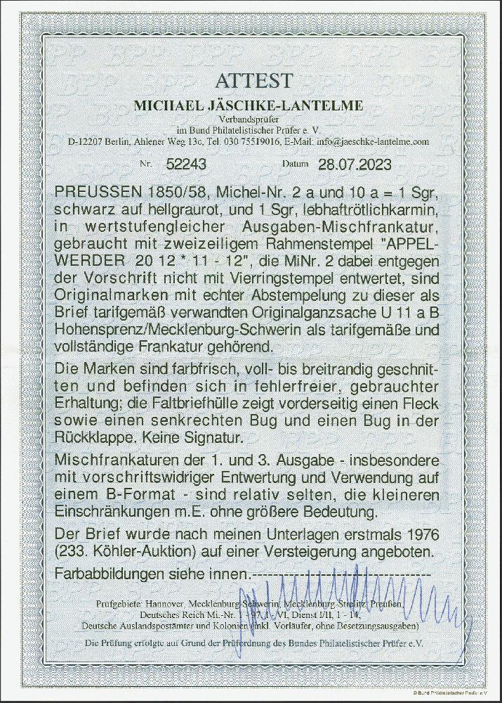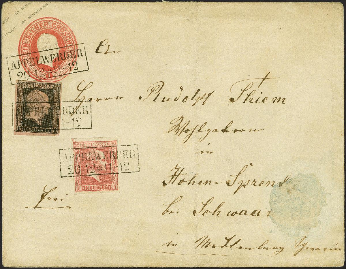 | Zusatzinformationen und Suchstichworte: | 82. Auktion Heinrich Köhler 18. – 23. September 2023 Los 245 Umschlag 1 Silbergroschen rosa im Großformat, mit wertstufengleicher Zufrankatur 1850,1 Silbergroschen schwarz auf rosa, in Mischfrankatur mit Gittergrund 1 Silbergroschen rosa, beide farbfrisch und voll- bis breitrandig, mit jeweils sauber aufgesetztem Rahmenstempel "APPELWERDER 20 12" nach Hohen Sprenz bei Schwaan in Mecklenburg Schwerin. Die Frankatur ist tadellos, der Umschlag senkrecht gefaltet und vorderseitig mit Fleck sowie waagerechte Bugspuren in der Rückklappe. Eine in dieser Form wahrscheinlich einmalige Kombination. Fotoattest Jäschke-L. BPP (2023) Ausruf 500,00 EUR |