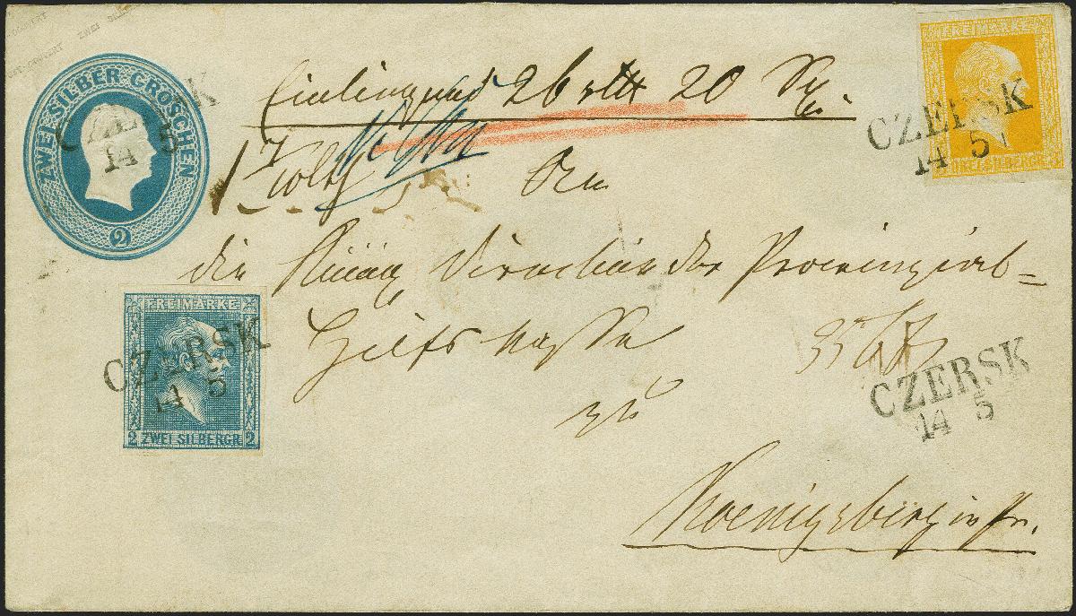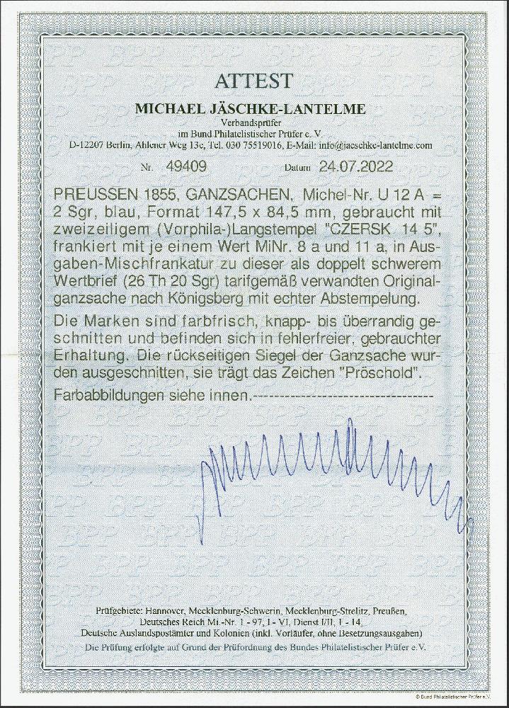| Zusatzinformationen und Suchstichworte: | 382. Auktion Heinrich Köhler 18. – 23. September 2023 Los 248 1855, Umschlag 2 Silbergroschen blau mit Zufrankatur Glatter Grund 3 Silbergroschen orange und Gittergrund 2 Silbergroschen blau, beide voll- bis breitrandig, mit vorphilatelistischem Zweizeiler "CZERSK 14 5" als Wertbrief (rückseitige Siegel ausgeschnitten) nach Königsberg. Sehr schöne und seltene Mischfrankatur in einwandfreier Erhaltung. Signiert Pröschold und Fotoattest Jäschke-L. BPP (2022) Ausruf 300,00 EUR |