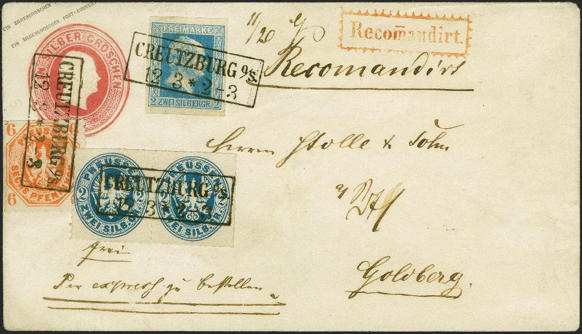 | Zusatzinformationen und Suchstichworte: | 382. Auktion Heinrich Köhler 18. – 23. September 2023 Los 252 Umschlag 1 Silbergroschen rosa, mit glatter Grund 2 Silbergroschen blau, in Mischfrankatur mit Wappen 6 Pfennig rotorange und 2 Silbergroschen preußischblau im waagerechten Paar, mit sauber aufgesetztem Rahmenstempel "CREUTZBURG O/S. 12 3" als eingeschriebener Expreß-Brief nach Goldberg. Ein Wert des Paares oben minimaler Scherenschnitt, sonst einwandfrei (Frankatur war zur Kontrolle gelöst). Ein äußerst attraktiver Expressbrief mit in dieser Form sehr seltener wertstufengleicher Mischfrankatur. Fotoattest Jäschke-L. BPP (2023) Ausruf 1.000,00 EUR |