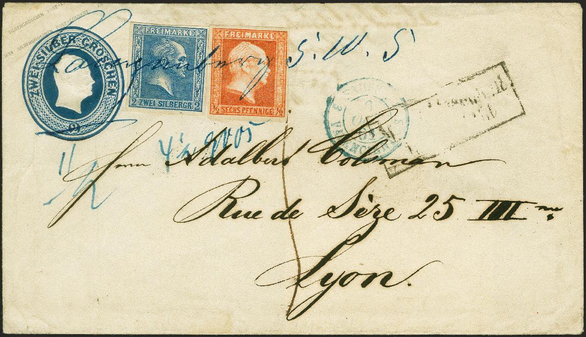 | Zusatzinformationen und Suchstichworte: | 382. Auktion Heinrich Köhler 18. – 23. September 2023 Los 253 1859, Umschlag 2 Silbergroschen blau, mit Zufrankatur Gittergrund ½ Silbergroschen orange und 2 Silbergroschen blau, beide voll- bis breitrandig, mit handschriftlicher Entwertung "Langenberg" nach Lyon, mit Transit- und Ankunftsstempeln. Offensichtlich viel der Brief in die 2.französischen Gewichtsstufe und ist mit "5" Decimen nachtaxiert, nebengesetzt schwacher Rahmenstempel "Affranchisement insuffisante". Ein seltener und attraktiver Bahnpost-Brief. Leichte Beförderungs- bzw. Altersspuren, sonst einwandfrei. Signiert Kruschel, Metzer und Kastaun BPP, Fotoattest Jäschke-L. BPP (2022) Ausruf 300,00 EUR |