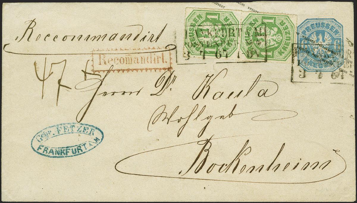 | Zusatzinformationen und Suchstichworte: | 382. Auktion Heinrich Köhler 18. – 23. September 2023 Los 261 Umschlag 6 Kr. ultramarin mit Zufrankatur 1 Kreuzer grün im senkrechten Paar, mit Rahmenstempel "FRANKFURT A.M. POSTEXPED.No.4 3 7 67" als Charge-Brief nach Bockenheim. Die Frankatur setzt sich zusammen aus 2 Kreuzer Nahbereichsporto und 6 Kreuzer Einschreibegebühr. Ein seltener Brief in einwandfreier Erhaltung. Fotoattest Jäschke-L. BPP (2023) Ausruf 500,00 EUR |