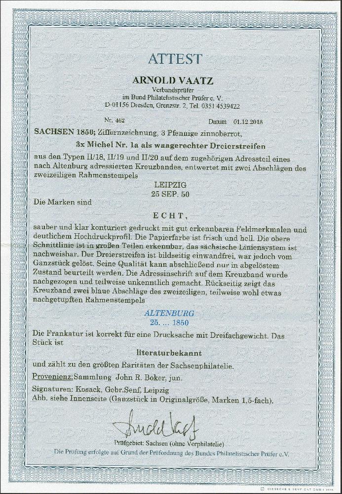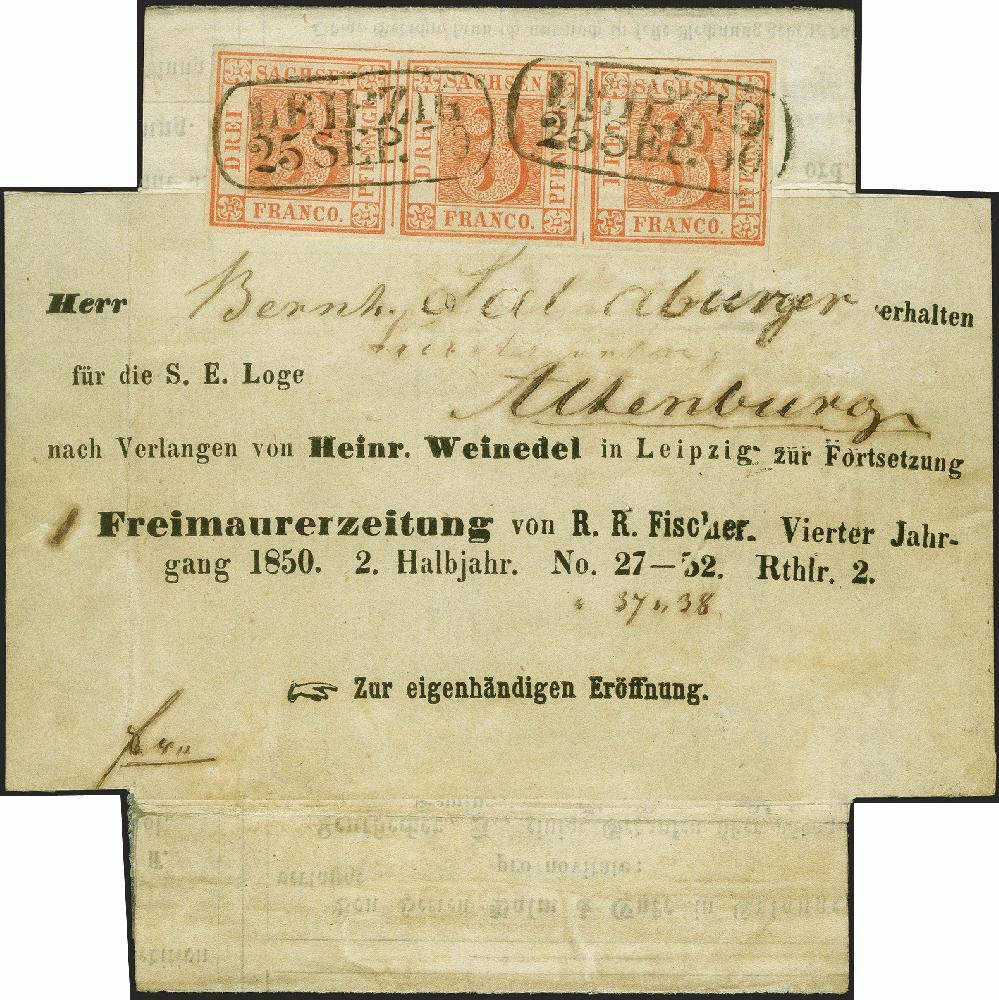 | Zusatzinformationen und Suchstichworte: | 382. Auktion Heinrich Köhler 18. – 23. September 2023 Los 264 1850, 3 Pfennig ziegelrot in waagerechtem Dreierstreifen, Platte II, Typen 18—20, sehr schöne frische und kräftige Farbe und klarer Druck, allseits breitrandig, oben mit Teilen der Schnittlinien, mit zweimal klar aufgesetztem Kastenstempel "LEIPZIG 25. Sep. 50" auf Kreuz-Streifband (waagerechte Seitenteile fehlen) der "Freimaurerzeitung" nach Altenburg mit blauem Ankunftsstempel vom selben Tag (etwas verstärkt). Der Name in der Anschrift entfernt und nachempfunden; der Streifen war zur Kontrolle gelöst und replatziert, Mängel sind – auch unter VSC 8000 – nicht feststellbar. Eine große Seltenheit der Sachsen-Philatelie; es sind nur drei weitere 3er-Streifen der Nr. 1 auf Ganzstück bekannt, davon 2 fehlerhaft bzw. repariert. Signiert Kosack und Gebrüder Senf, Fotoattest Vaatz BPP (2018) Ausruf 50.000,00 EUR |