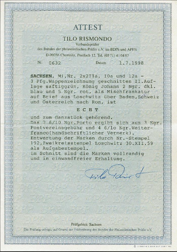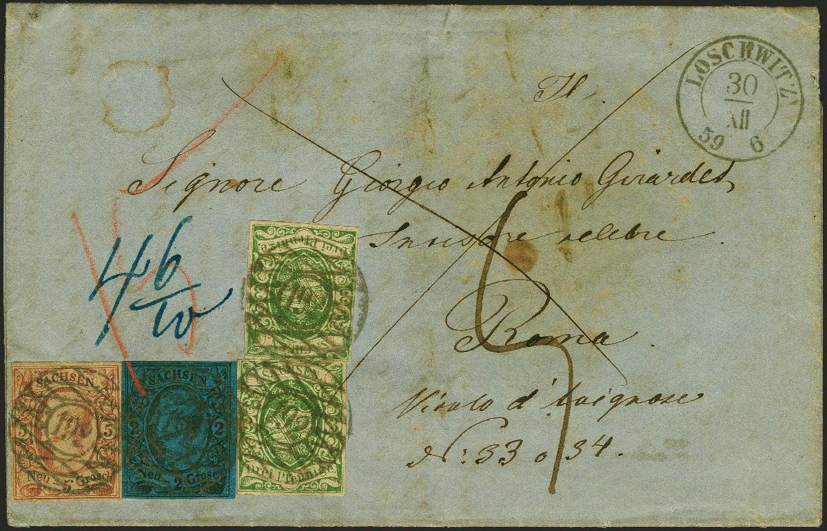 | Zusatzinformationen und Suchstichworte: | 382. Auktion Heinrich Köhler 18. – 23. September 2023 Los 266 1851/63, Wappen 3 Pfennige saftiggrün, 2 Einzelwerte, zusammen mit Johann 5 Neugroschen ziegelrot und 2 Neugroschen auf dunkelblau, alle farbfrisch, eine 3 Pfennige Ausgabe typischer knapper Schnitt, sonst alle vollrandig, mit sauberer Nr. "192" und nebengesetztem Doppelkreisstempel "LOSCHWITZ 30/XII 59" auf komplettem Faltbrief über Baden und die Schweiz nach Rom. Der Brief ist nach dem Tarif vom 1.11.1859 korrekt frankiert mit 3 Neugroschen Vereinsgebühr und 4 Neugroschen, 6 Pfennige Weiterfranko bis zur Grenze des Kirchenstaates, das dortige Inlandsporto von "5" Bajocci wurde vom Empfänger erhoben. Übliche leichte Transportspuren und geringe Patina, sonst einwandfrei. Ein äußerst seltener früher Auslandsbrief. Fotoatteste Rismondo BPP (1998) und Vaatz BPP (2022) Ausruf 3.000,00 EUR |