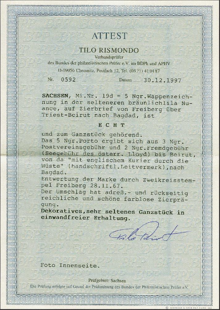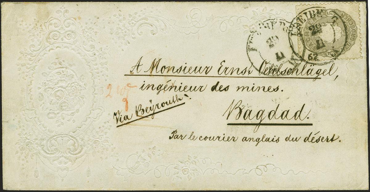 | Zusatzinformationen und Suchstichworte: | 382. Auktion Heinrich Köhler 18. – 23. September 2023 Los 275 Wappen 5 Neugroschen graulila, farbtief und gut gezähnt (oben Scherentrennung außerhalb), mit sauberem Doppelkreisstempel "FREIBERG 29 II 62" auf äußerst dekorativem, vorder- und rückseitig aufwendig geprägtem Zierkuvert, via Triest und Beirut an "Ernst Oehlschlägel, ingénieur des mines" in Bagdad. Handschriftliche Leitvermerke "Via Beyrouth" und "Par le courier anglais du désert" für die 'overland mail'. Rückseitig Transitstempel von Dresden, Bodenbach und Triest. Sehr schöne und einwandfreie Erhaltung. Es sind nur wenige Briefe von Sachsen in den Vorderen Orient bekannt. Ein faszinierendes Stück. Fotoattest Rismondo BPP Ausruf 5.000,00 EUR |