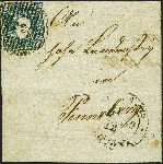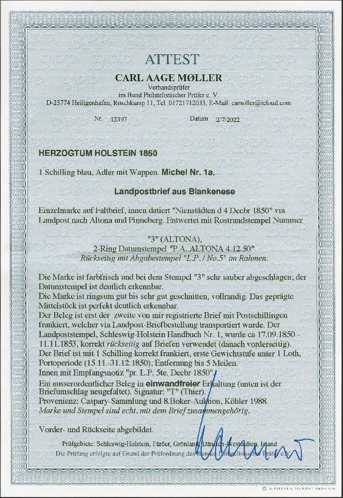 | Zusatzinformationen und Suchstichworte: | 382. Auktion Heinrich Köhler 18. – 23. September 2023 Los 280 1 Schilling blau mit schöner Wappenprägung, farbfrisch und voll- bis meist breitrandig, mit leicht und klar aufgesetztem Roststempel "3" und leicht nebengesetztem Doppelkreisstempel "P.A.ALTONA 4 12 1850" auf komplettem kleinen Faltbrief, datiert "Nienstädten d 4 Decbr 1850" und mit rückseitigem klar aufgesetztem Landpoststempel "L.P.No.5" nach Pinneberg. Sehr schöne frische und einwandfreie Erhaltung. Ein attraktiver und äußerst seltener Brief; es ist nur ein weiterer Brief der 1.Ausgabe mit einer Landpost-Beförderung registriert. Signiert Thier und Fotoattest Moeller BPP (2022) Ausruf 5.000,00 EUR |