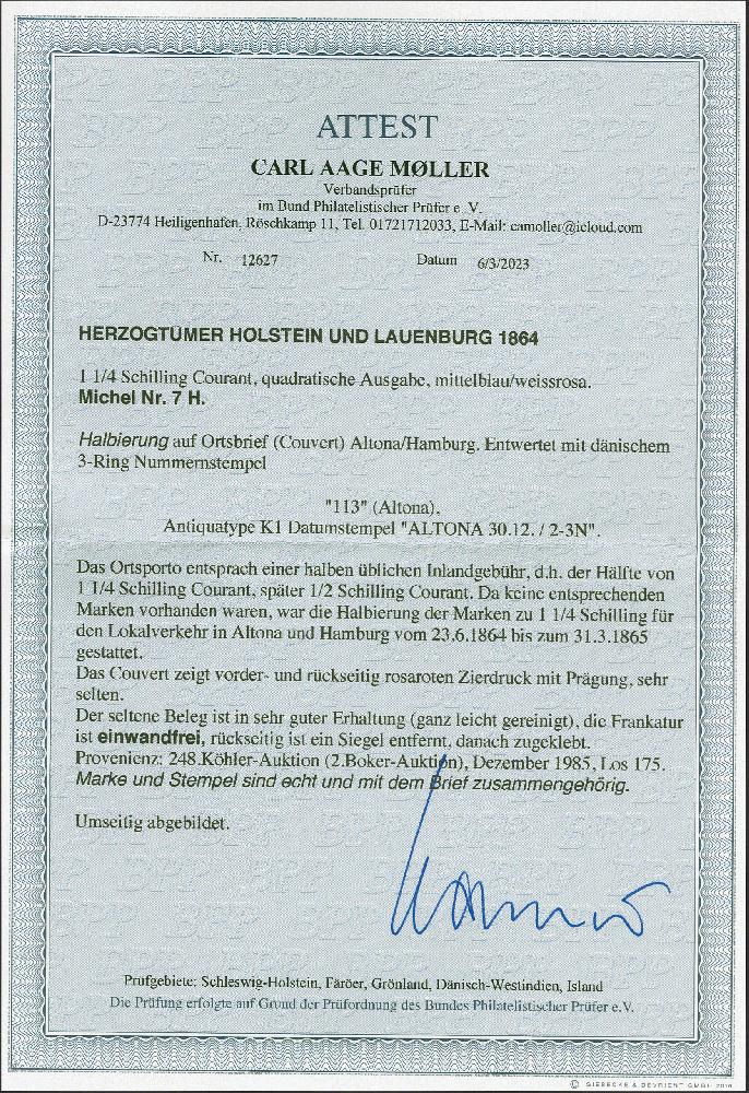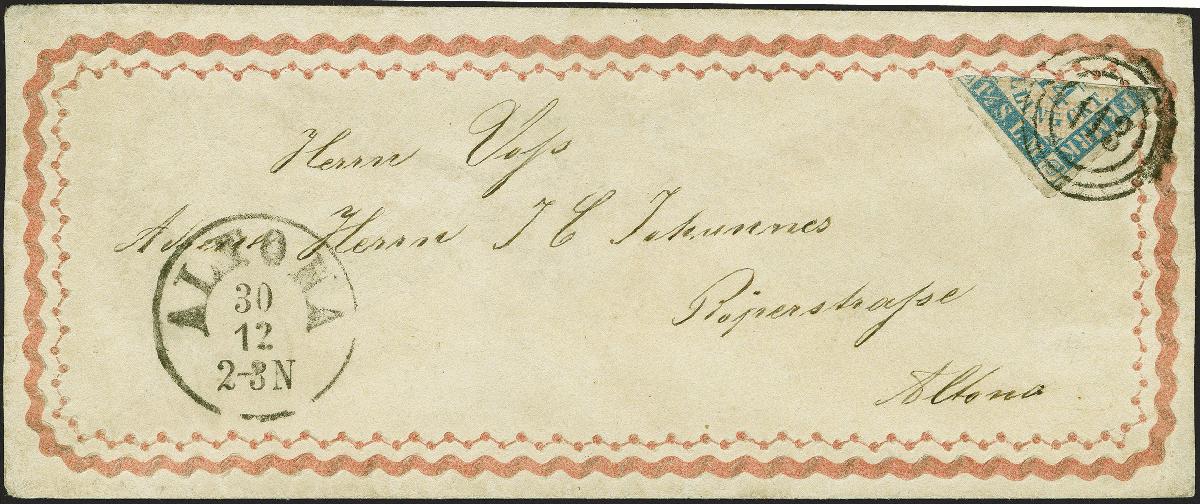 | Zusatzinformationen und Suchstichworte: | 382. Auktion Heinrich Köhler 18. – 23. September 2023 Los 283 ¼ Schilling CRT., blau/rosa, diagonal halbiert, rechte untere Hälfte, farbfrisch und gut durchstochen, mit sauber aufgesetzter Nr. "113" und sauber nebengesetztem Einkreisstempel "ALTONA 30/12" auf kleinem Briefkuvert mit geprägter und rosafarben bedruckter Zierborde, als Ortsbrief gelaufen. Rückseitiges Siegel ausgeschnitten und überklebt, sonst einwandfrei. Ein sehr attraktiver kleiner Brief. Fotoattest Moeller BPP (2023) Ausruf 1.500,00 EUR |