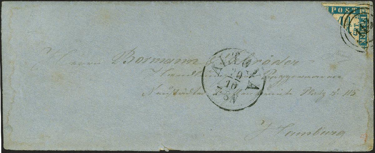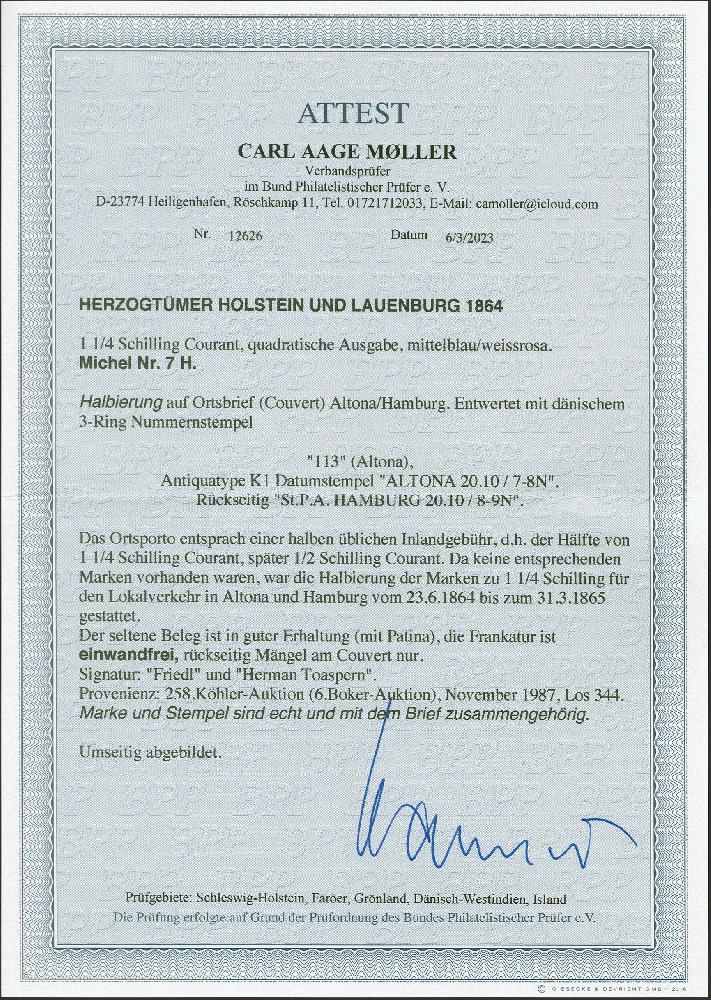 | Zusatzinformationen und Suchstichworte: | 382. Auktion Heinrich Köhler 18. – 23. September 2023 Los 284 ¼ Schilling CRT., blau/rosa, diagonal halbiert, rechte obere Hälfte, farbfrisch und gut durchstochen, mit sauber aufgesetzter Nr. "113" und sauber nebengesetztem Einkreisstempel "ALTONA 20/10" auf kleinem blauen Briefkuvert nach Hamburg mit Ankunftsstempel des Stadtpostamtes. Rückseitig kleine Fehlstelle und insgesamt leichte Patina, sonst einwandfrei. Ein attraktiver Brief. Signiert Friedl und Herman Toaspern, Fotoattest Moeller BPP (2023) Ausruf 800,00 EUR |