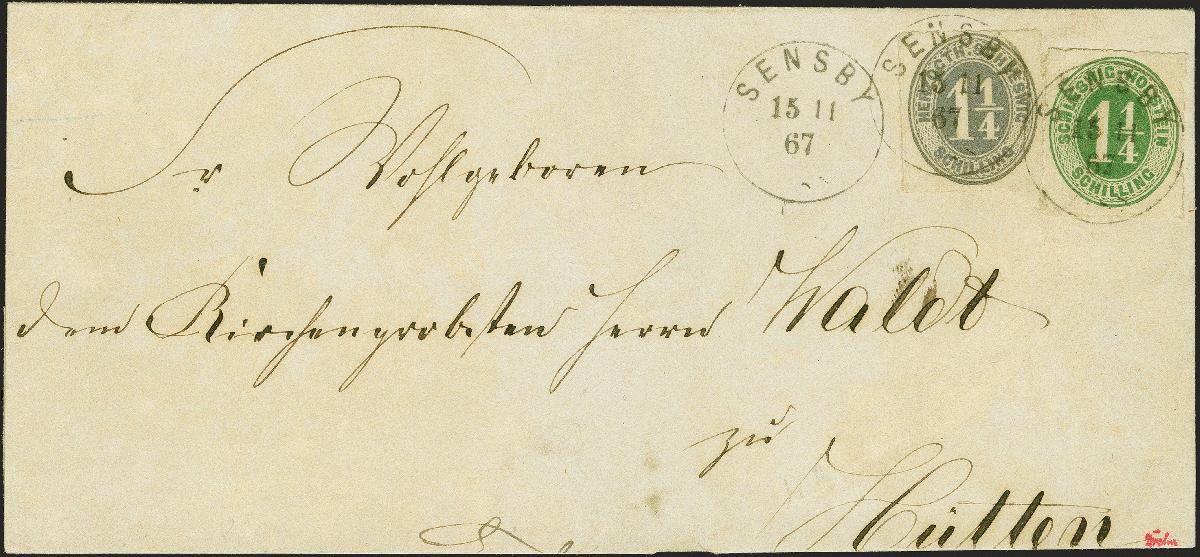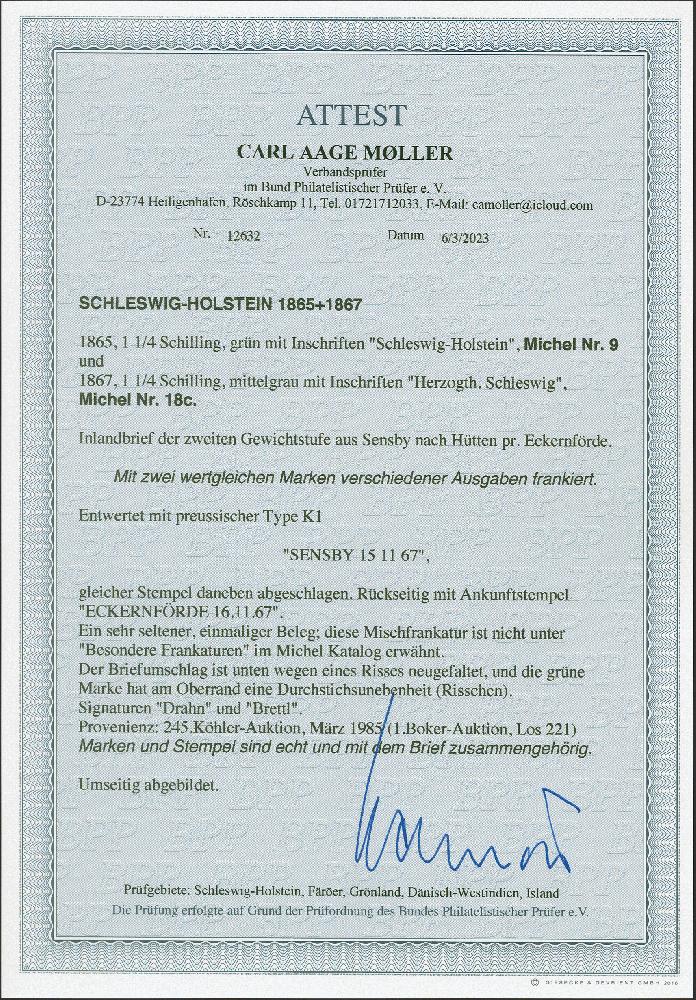 | Zusatzinformationen und Suchstichworte: | 382. Auktion Heinrich Köhler 18. – 23. September 2023 Los 286 'SCHLESWIG-HOLSTEIN' 1¼ Schilling grün in wertstufengleicher Mischfrankatur mit 'HERZOGTH.SCHLESWIG' 1¼ Schilling mittelgrau, beide farbfrisch und gut durchstochen, mit sauber auf- und nebengesetztem Einkreisstempel "SENSBY 15 11 67" auf Briefhülle der 2. Gewichtsstufe nach Hütten bei Eckernförde. Die grüne Marke am Oberrand kleiner Randspalt, die Hülle unten umgefaltet, sonst einwandfrei. Eine einmalige und attraktive Mischfrankatur. Signiert Drahn und Brettl, Fotoattest Möller BPP (2023) Ausruf 2.000,00 EUR |