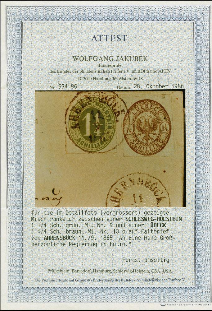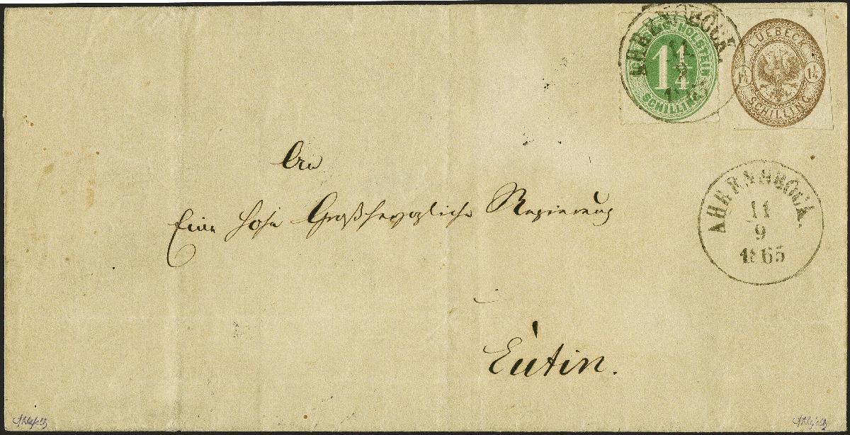 | Zusatzinformationen und Suchstichworte: | 382. Auktion Heinrich Köhler 18. – 23. September 2023 Los 287 SCHLESWIG-HOLSTEIN 1½ Schilling grün, zusammen mit Lübeck 1864, 1½ Schilling dunkelbraun. entwertet mit holsteinischem Einkreisstempel "AHRENSBÖCK 11/9.1865" auf Briefhülle an die Großherzogliche (Oldenburgische) Regierung nach Eutin, portogerecht frankiert für die 2. Gewichtsstufe. Eine attraktive und einmalige, unbeanstandet beförderte Frankatur. Signiert Ahlefeld und Fotoattest Jakubek BPP (1986) Provenienz: John Boker jr. (1988) Ausruf 10.000,00 EUR |