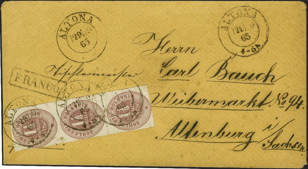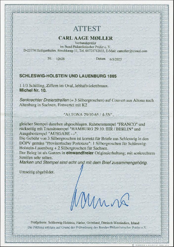 | Zusatzinformationen und Suchstichworte: | 382. Auktion Heinrich Köhler 18. – 23. September 2023 Los 289 1⅓ Schilling lila, senkrechter 3er-Streifen, farbfrisch und gut durchstochen, mit sauber auf- und nebengesetztem Doppelkreisstempel "ALTONA 29/10 65" auf Briefkuvert mit nebengesetztem Rahmenstempel "FRANCO" nach Altenburg in Sachsen. Schöne und einwandfreie Erhaltung. Fotoattest Moeller BPP (2023) Ausruf 300,00 EUR |