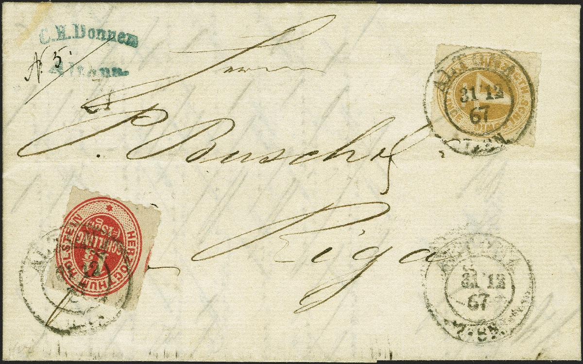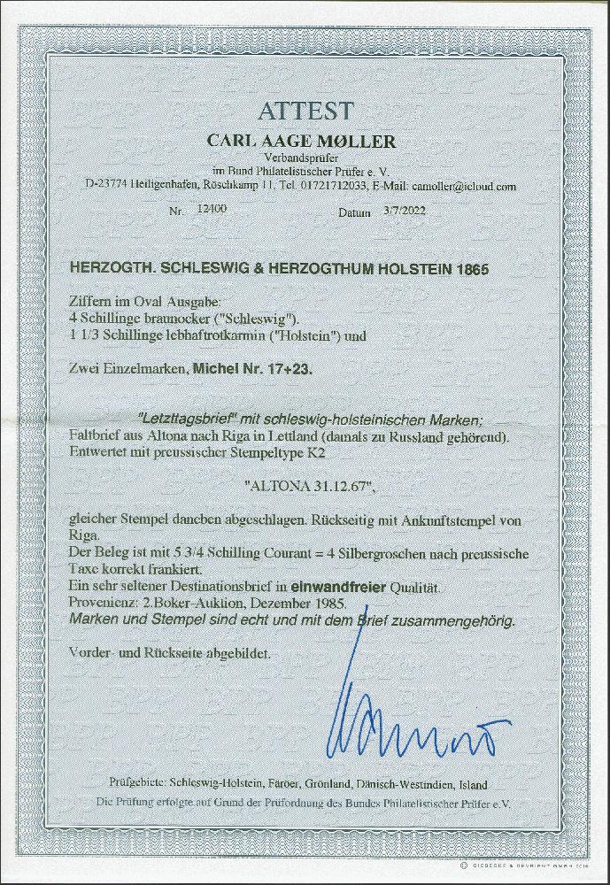 | Zusatzinformationen und Suchstichworte: | 382. Auktion Heinrich Köhler 18. – 23. September 2023 Los 296 1⅓ Schilling lebhaftrotkarmin in Mischfrankatur mit 'HERZOGTH. SCHLESWIG' 4 Schilling ocker, beide farbfrisch und gut durchstochen, mit auf- und nebengesetztem Doppelkreisstempel "ALTONA 31/12 67" auf komplettem Faltbrief nach Riga mit Ankunftsstempel. Es sind nur wenige Briefe aus Schleswig-Holstein nach Russland registriert, als Brief vom letzten Tag der schleswig-holsteinischen Post ein besonders interessantes und wertvolles Stück. Fotoattest Möller BPP (2022) Ausruf 2.000,00 EUR |