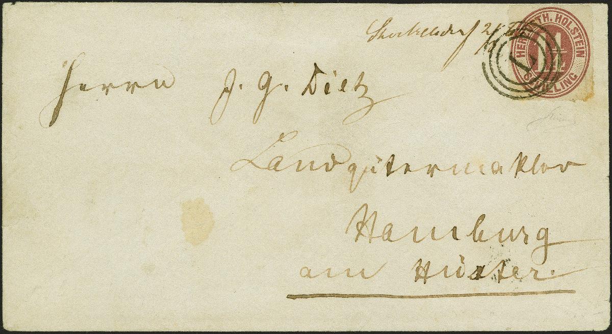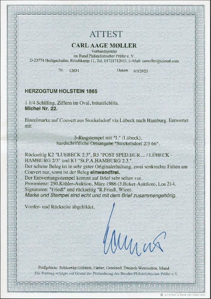 | Zusatzinformationen und Suchstichworte: | 382. Auktion Heinrich Köhler 18. – 23. September 2023 Los 298 'HERZOGTH.HOLSTEIN' 1¼ Schilling bräunlichlila, farbfrisch und mit üblichem, teils etwas unregelmäßigen Durchstich, mit sauber aufgesetztem Lübecker Ringsstempel "L" und teils übergehendem handschriftlichen Aufgabevermerk "Stockelsdorf 2/3 66" auf Briefkuvert nach Hamburg; rückseitig Durchgangsstempel von Lübeck, Bahnpoststempel "LÜBECK-HAMBURG " und Ankunftsstempel des Stadtpostamtes. Das Kuvert außerhalb der Frankatur leicht gefaltet, sonst gute Erhaltung. Ein seltener Brief. Signiert Friedl und Fotoattest Moeller BPP (2023) Ausruf 500,00 EUR |