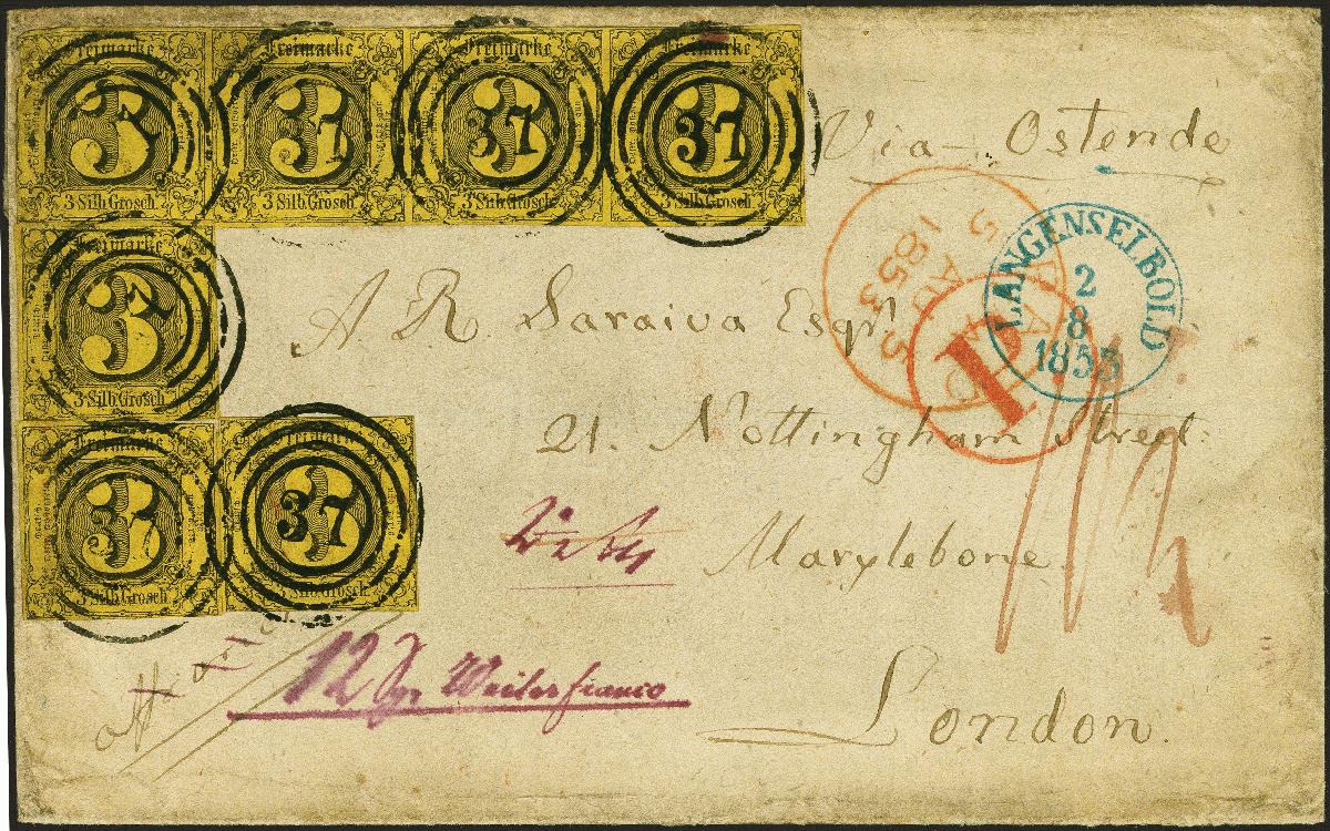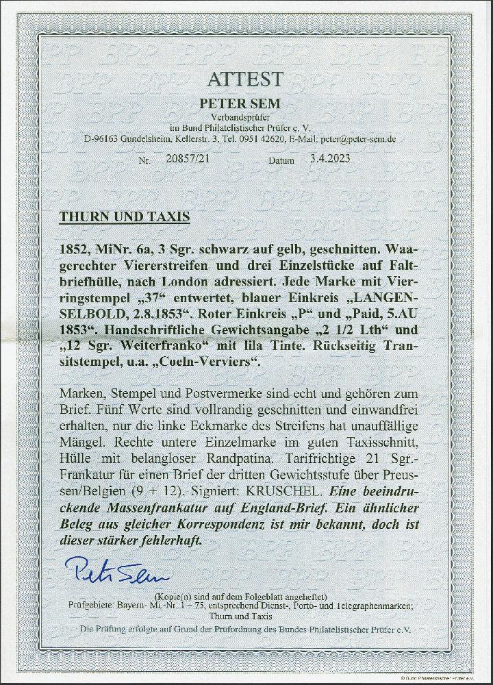 | Zusatzinformationen und Suchstichworte: | 382. Auktion Heinrich Köhler 18. – 23. September 2023 Los 302 3 Silbergroschen auf gelb, waagerechter Viererstreifen und 3 Einzelstücke, alle farbfrisch und in gutem Taxis-Schnitt, 5 Werte vollrandig und einwandfrei, mit jeweils sauber aufgesetzter Nr. "37" und klar nebengesetztem blauem Einkreisstempel "LANGENSELBOLD 2 8 1855" auf Briefhülle der 3.Gewichtsstufe über Preußen und Belgien nach London, mit vorderseitig ausgewiesenem Weiterfranko von 12 Silbergroschen. Der linke Wert des Streifens durch Randklebung unauffällig fehlerhaft, die Hülle im Randbereich etwas Patina, sonst gute Erhaltung. Eine attraktive und sehr seltene große Mehrfachfrankatur; es ist nur eine weitere, jedoch etwas stärker fehlerhafte registriert. Signiert Kruschel und Fotoattest Sem BPP (2023) Ausruf 1.000,00 EUR |
