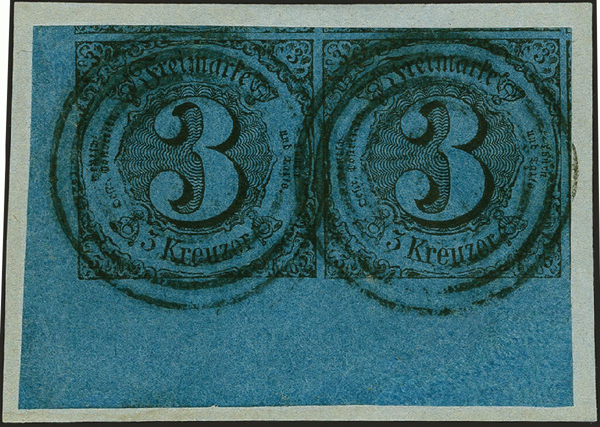 | Zusatzinformationen und Suchstichworte: | 382. Auktion Heinrich Köhler 18. – 23. September 2023 Los 303 3 Kreuzer auf dunkelblau, waagerechtes Paar aus der linken unteren Bogenecke, allseits überrandig mit Teilen aller Nachbarmarken und 4/12 mm Bogenrändern links und unten, mit Nummernstempel entwertet auf kleinem Briefstück. Im breiten Bogenrand rechts unten ein Teil ergänzt, sonst einwandfrei. Ein bemerkenswertes und außerordentlich seltenes Eckrandpaar. Signiert Sommer BPP und Fotoattest Sem BPP (2023) Ausruf 500,00 EUR |