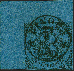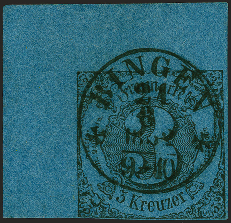 | Zusatzinformationen und Suchstichworte: | 382. Auktion Heinrich Köhler 18. – 23. September 2023 Los 305 3 Kreuzer auf dunkelblau, linke obere Bogenecke, farbfrisch und voll- bis breitrandig, links und oben mit 10/11 mm Bogenrand, zentrisch entwertet durch klaren vorphilatelistischen Einkreisstempel "BINGEN 21 8 1852". Ein Ausnahmestück in tadelloser Erhaltung. Signiert Pfenninger, Fotoattest Sem BPP (2018) Ausruf 1.000,00 EUR |