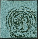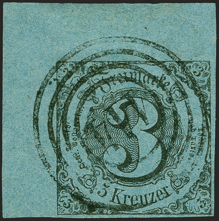 | Zusatzinformationen und Suchstichworte: | 382. Auktion Heinrich Köhler 18. – 23. September 2023 Los 306 3 Kreuzer auf hellgrünlichblau, linke obere Bogenecke, farbfrisch und allseits voll- bis breitrandig, links und oben mit 7/8 mm Bogenrand, sehr sauber zentrisch entwertet durch Nr. "114" GERNSHEIM. Ein Ausnahmestück in tadelloser Erhaltung. Signiert Köhler und Brettl, Fotoattest Sem BPP (2018) Ausruf 500,00 EUR |