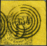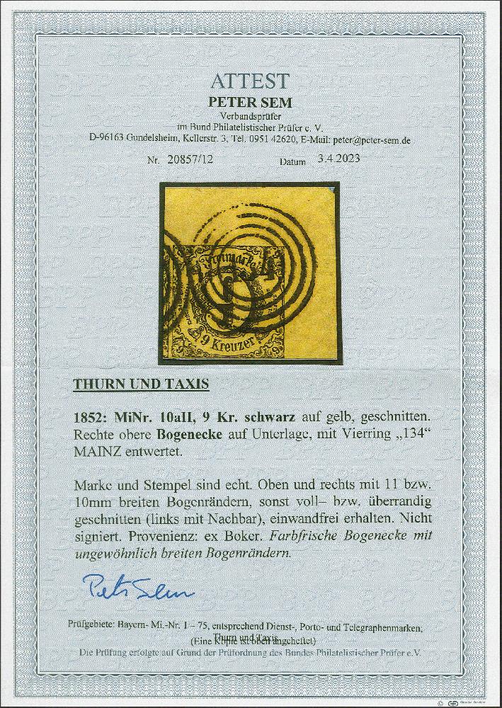 | Zusatzinformationen und Suchstichworte: | 382. Auktion Heinrich Köhler 18. – 23. September 2023 Los 308 9 Kreuzer auf gelb, rechte obere Bogenecke, unten voll-, links überrandig mit Teil der Nachbarmarke, oben und rechts mit ca. 10/11 mm Bogenrand, mit gerade und klar aufgesetzter Nr. "134" MAINZ auf kurzgeschnittenem Briefstück (dieses in der rechten oberen Ecke etwas geschürft). Ein Ausnahmestück in einwandfreier Erhaltung. Fotoattest Sem BPP (2023) Ausruf 500,00 EUR |
