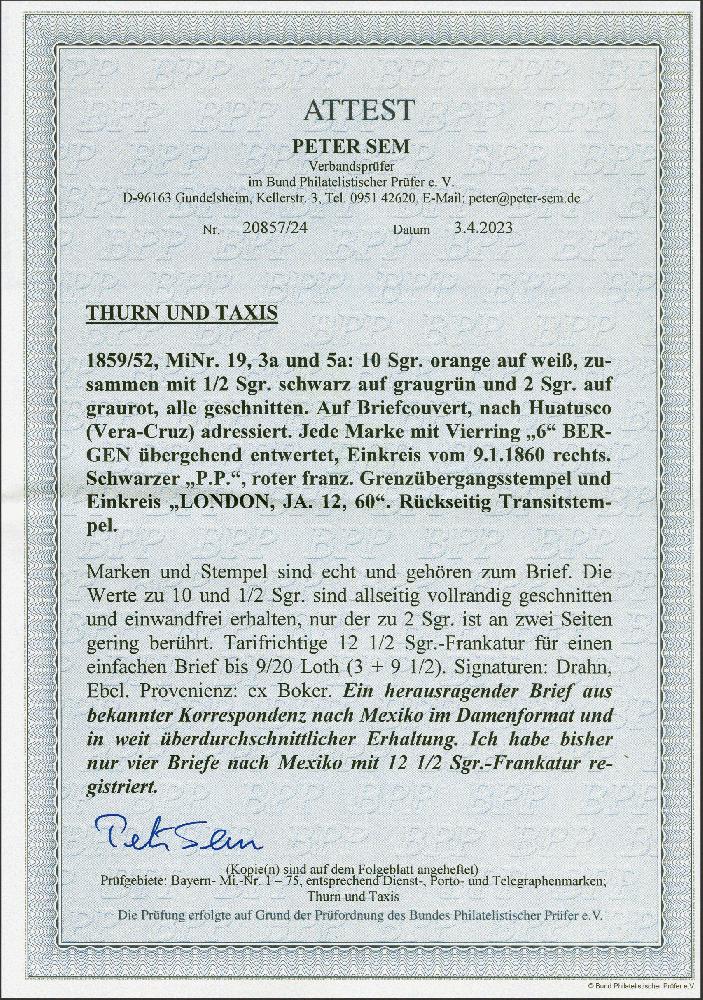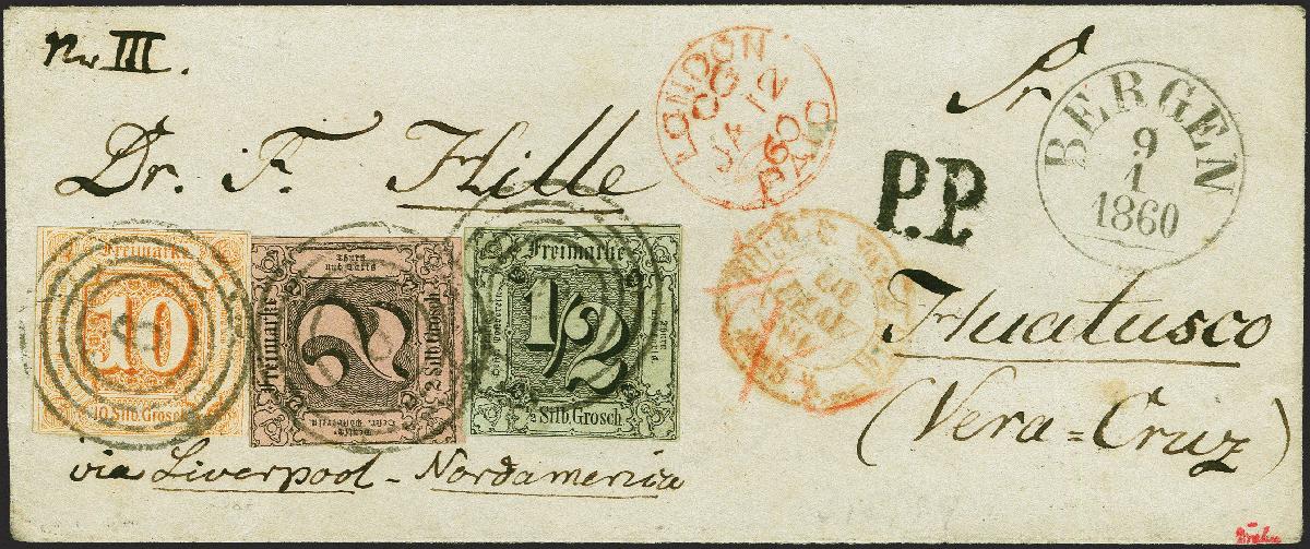 | Zusatzinformationen und Suchstichworte: | 382. Auktion Heinrich Köhler 18. – 23. September 2023 Los 312 10 Silbergroschen orange, voll- bis breitrandig, in Mischfrankatur mit 1852, ½ Silbergroschen schwarz auf graugrün und 2 Silbergroschen schwarz auf graurot, mit Nr. "6" und klar nebengesetztem Einkreisstempel "BERGEN 9 1 1860" auf kleinem Briefkuvert über Frankreich und England nach Huatusco in Mexiko, mit vorderseitigem Durchgangsstempel von London und rückseitigen französischen Transitstempeln. Die 10 Silbergroschen leicht oxidiert, sonst sehr frische und einwandfreie Erhaltung. Ein sehr attraktiver und ausgesprochener seltener Brief. Signiert Drahn und Fotoattest Sem BPP (2023) Ausruf 4.000,00 EUR |