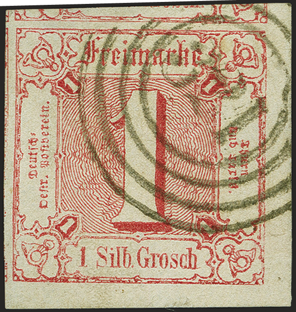 | Zusatzinformationen und Suchstichworte: | 382. Auktion Heinrich Köhler 18. – 23. September 2023 Los 315 1 Silbergroschen karminrot, allseits überrandige rechte untere Bogenecke, zweiseitig mit Teilen von Nachbarmarken, rechts und unten mit ca. 2mm Bogenrand, sauber entwertet durch Nr. "321" DETMOLD. Tadellos. Fotobefund Sem BPP (2023) Ausruf 100,00 EUR |