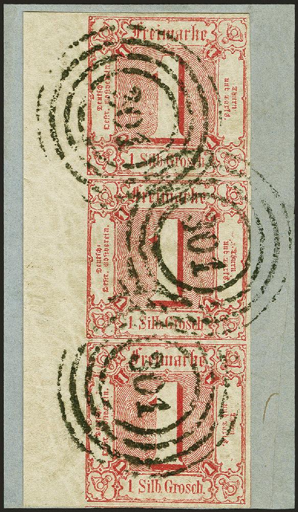| Zusatzinformationen und Suchstichworte: | 382. Auktion Heinrich Köhler 18. – 23. September 2023 Los 317 1 Silbergroschen karminrot, senkrechter 3er-Streifen vom linken Bogenrand, allseits breitrandig, mit ca. 8 mm Bogenrand, mit leicht und sauber aufgesetzter Nr."301" BREMEN auf Briefstück (zur Kontrolle gelöst und mit Falz replatziert). Ein Ausnahmestück in tadelloser Erhaltung. Fotoattest Sem BPP (2023) Ausruf 500,00 EUR |