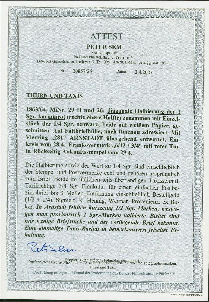 | Zusatzinformationen und Suchstichworte: | 382. Auktion Heinrich Köhler 18. – 23. September 2023 Los 318 1 Silbergroschen karminrot, diagonal halbiert, rechte obere Hälfte, zusammen mit ¼ Silbergroschen schwarz, beide in Taxis-üblichem Schnitt, mit übergehend aufgesetzter Nr. 281 und nebengesetztem Einkreisstempel "ARNSTADT 28 4" auf Briefhülle an das Großherzogliche Justizamt in Ilmenau, portogerecht frankiert für den Nahbereich mit vorausbezahltem Bestellgeld (handschriftlicher Vermerk "frei"). Schöne und einwandfreie Erhaltung. In Arnstadt fehlten kurzzeitig ½ Silbergroschen-Marken, weshalb man provisorisch 1 Silbergroschen-Werte halbierte. Es sind bisher nur wenige Briefstücke und der hier angebotene Brief mit dieser Halbierung aus Arnstadt bekannt. Eines der wenigen bekannten Ganzstücke von Thurn und Taxis mit einer Halbierung und eine große Altdeutschland-Seltenheit. Signiert Hennig, Weimar, und Fotoattest Sem BPP (2023) Ausruf 20.000,00 EUR |
