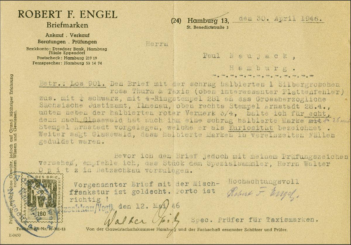 | Zusatzinformationen und Suchstichworte: | 382. Auktion Heinrich Köhler 18. – 23. September 2023 Los 318 1 Silbergroschen karminrot, diagonal halbiert, rechte obere Hälfte, zusammen mit ¼ Silbergroschen schwarz, beide in Taxis-üblichem Schnitt, mit übergehend aufgesetzter Nr. 281 und nebengesetztem Einkreisstempel "ARNSTADT 28 4" auf Briefhülle an das Großherzogliche Justizamt in Ilmenau, portogerecht frankiert für den Nahbereich mit vorausbezahltem Bestellgeld (handschriftlicher Vermerk "frei"). Schöne und einwandfreie Erhaltung. In Arnstadt fehlten kurzzeitig ½ Silbergroschen-Marken, weshalb man provisorisch 1 Silbergroschen-Werte halbierte. Es sind bisher nur wenige Briefstücke und der hier angebotene Brief mit dieser Halbierung aus Arnstadt bekannt. Eines der wenigen bekannten Ganzstücke von Thurn und Taxis mit einer Halbierung und eine große Altdeutschland-Seltenheit. Signiert Hennig, Weimar, und Fotoattest Sem BPP (2023) Ausruf 20.000,00 EUR |
