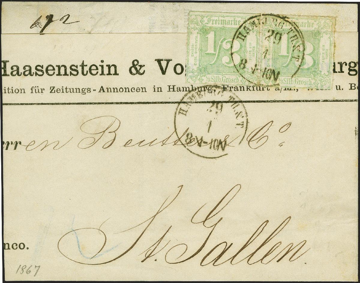 | Zusatzinformationen und Suchstichworte: | 382. Auktion Heinrich Köhler 18. – 23. September 2023 Los 319 ⅓ Silbergroschen gelbgrün, 2 Einzelwerte, beide farbfrisch, die linke oben Scherentrennung, sonst beide gut durchstochen, mit sauber auf- und nebengesetztem Einkreisstempel "HAMBURG TH. & T. 29 1" (1867) auf fast vollständiger Streifband-Sendung mit Korrekturabzug einer Annonce, nach St. Gallen in der Schweiz, mit Ankuftsstempel. Eine attraktive und seltene Auslands-Drucksache aus der bekannten Haasenstein & Vogler-Korrespondenz. Signiert Köhler und Kruschel, Fotoattest Sem BPP (2023) Ausruf 500,00 EUR |