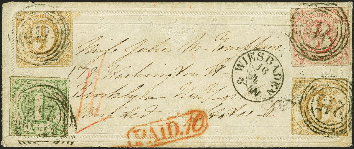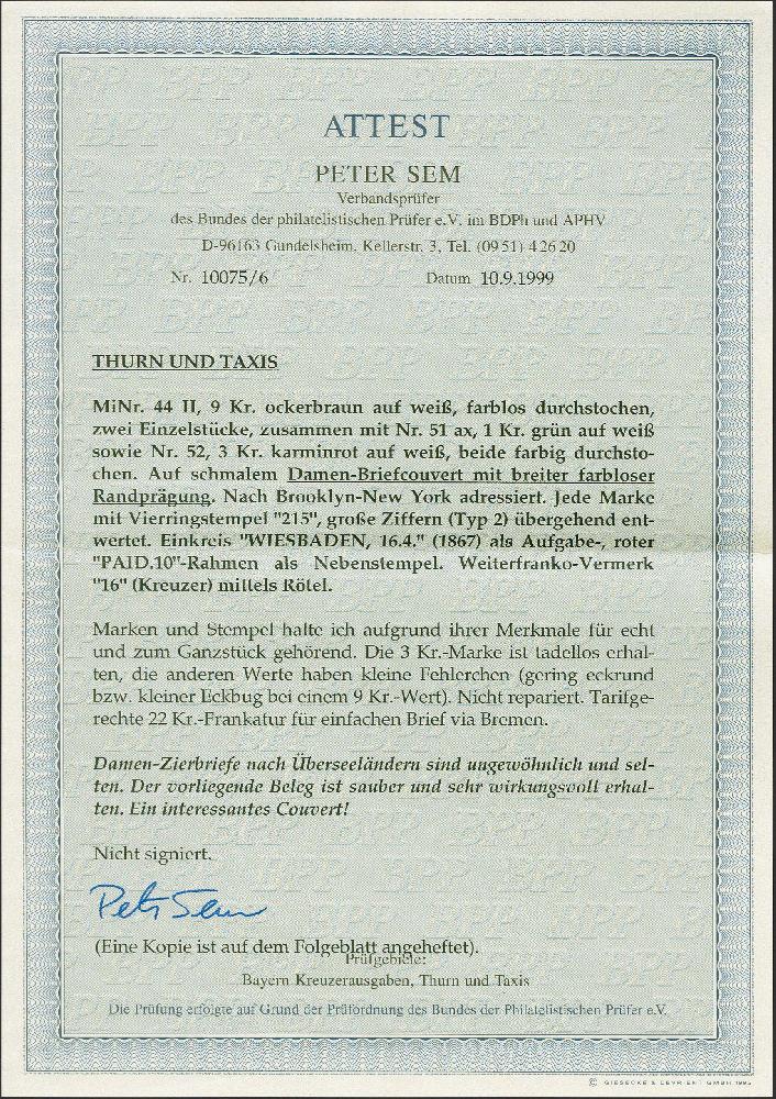 | Zusatzinformationen und Suchstichworte: | 382. Auktion Heinrich Köhler 18. – 23. September 2023 Los 321 9 Kreuzer ockerbraun, 2 Einzelwerte, in Mischfrankatur mit farbig durchstochen 1 Kreuzer grün und 3 Kreuzer karminrot, alle farbfrisch, mit Nr. "215" und sauber nebengesetztem Einkreisstempel "WIESBADEN 16 4" auf kleinem Damen-Kuvert mit geprägter Zierborde, über Bremen nach New York. Die Frankatur teils leicht fehlerhaft, das Kuvert übliche Transportspuren. Ein attraktiver und ungewöhnlicher Transatlantik-Zierbrief. Fotoattest Sem BPP (1999) Ausruf 300,00 EUR |