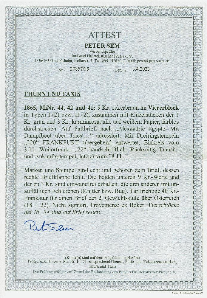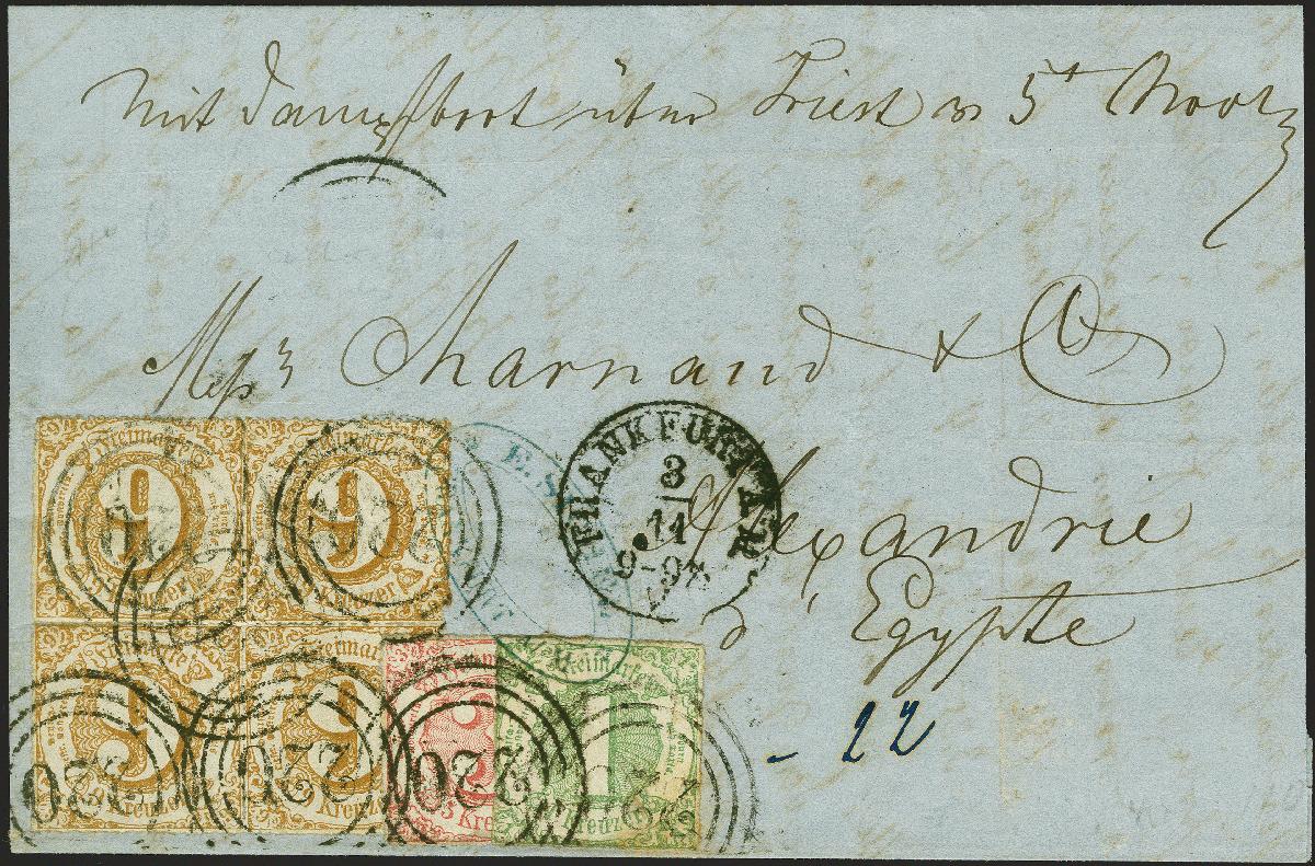 | Zusatzinformationen und Suchstichworte: | 382. Auktion Heinrich Köhler 18. – 23. September 2023 Los 322 9 Kreuzer ockerbraun im Viererblock, zusammen mit 1 Kreuzer grün und 3 Kreuzer karminrosa, treppenförmig geklebt, mit Nr. "220" und nebengesetztem Einkreisstempel "FRANKFURT A.M. 3/11" auf Faltbrief der 2.Gewichtsstufe (rechtes Seitenteil fehlend) mit Leitvermerk "Mit Dampfboot über Triest…" nach Alexandria, Ägypten, mit Transit- und Ankunftsstempeln. Der Viererblock mit waagerechter Bugspur und rechts kleinem Durchstichmangel, die 1 Kreuzer gering fehlerhaft, sonst gute und frische Erhaltung. Ein attraktiver und seltener Brief nach Nordafrika. Fotoattest Sem BPP (2023) Ausruf 1.000,00 EUR |