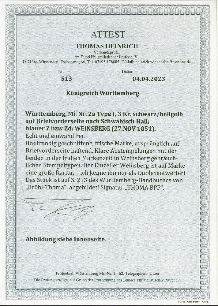 | Zusatzinformationen und Suchstichworte: | 382. Auktion Heinrich Köhler 18. – 23. September 2023 Los 328 3 Kreuzer schwarz auf hellgelb, Type I, farbfrisch und breitrandig, mit Duplex-Entwertung durch blauen einzeiligen Langstempel "WEINSBERG" sowie zweizeiligem Langstempel "WEINSBERG 27 NOV 1851", Letzterer zusätzlich nebengesetztem, auf Briefvorderseite mit einer Rückklappe, nach Schwäbisch Hall. Der Einzeiler ist als Entwerteter eine große Seltenheit. Signiert Thoma BPP mit Fotoattest (1981) und Fotoattest Heinrich BPP (2023) Ausruf 1.000,00 EUR |