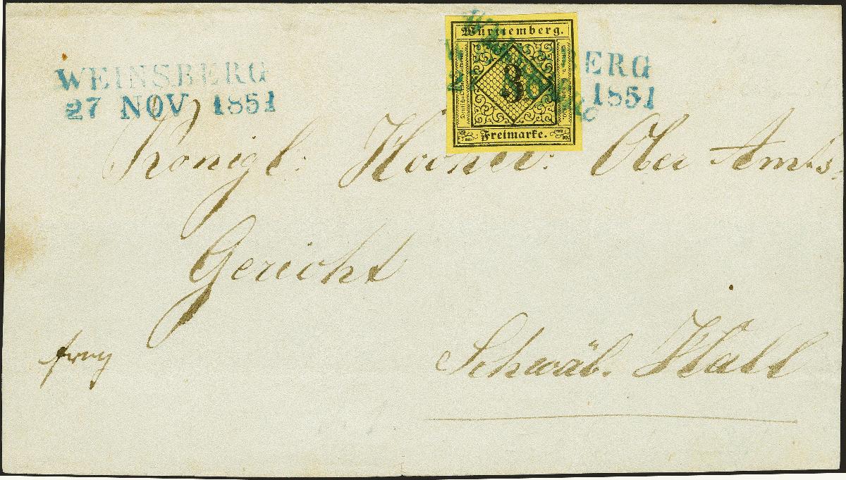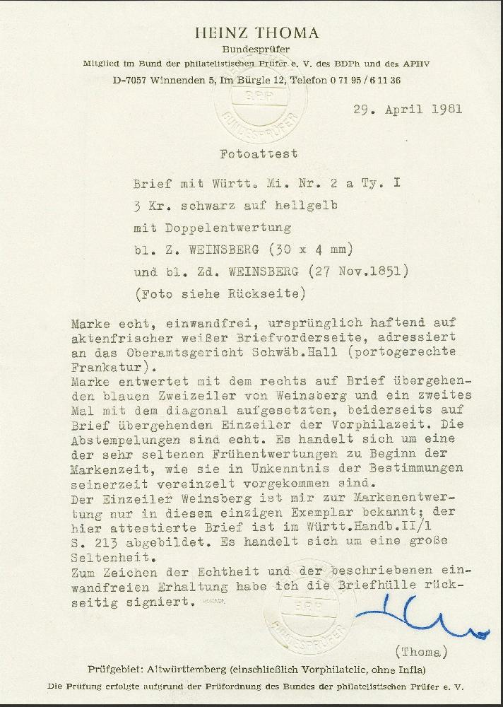 | Zusatzinformationen und Suchstichworte: | 382. Auktion Heinrich Köhler 18. – 23. September 2023 Los 328 3 Kreuzer schwarz auf hellgelb, Type I, farbfrisch und breitrandig, mit Duplex-Entwertung durch blauen einzeiligen Langstempel "WEINSBERG" sowie zweizeiligem Langstempel "WEINSBERG 27 NOV 1851", Letzterer zusätzlich nebengesetztem, auf Briefvorderseite mit einer Rückklappe, nach Schwäbisch Hall. Der Einzeiler ist als Entwerteter eine große Seltenheit. Signiert Thoma BPP mit Fotoattest (1981) und Fotoattest Heinrich BPP (2023) Ausruf 1.000,00 EUR |
