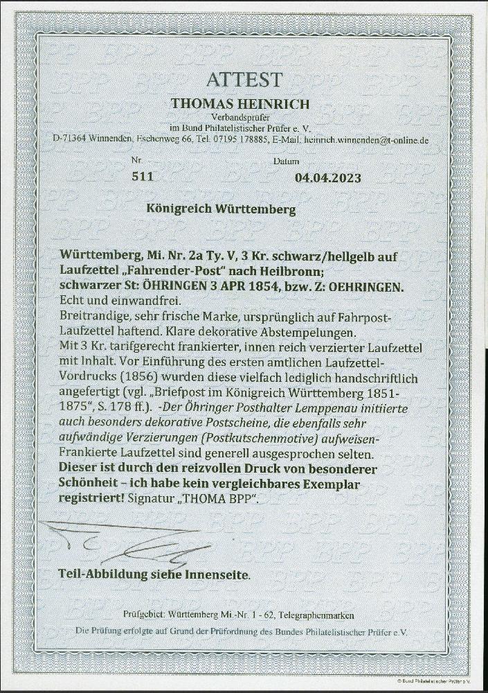 | Zusatzinformationen und Suchstichworte: | 382. Auktion Heinrich Köhler 18. – 23. September 2023 Los 330 3 Kreuzer schwarz auf hellgelb, farbfrisch und allseits breitrandig, mit sauber aufgesetztem Steigbügelstempel "ÖHRINGEN 3 APR. 1854" auf "Laufzettel fahrender Post" mit dekorativem Postkutschen-Motiv nach Heilbronn. Ein ebenso attraktives wie seltenes Stück in einwandfreier Erhaltung. Vor Einführung der ersten amtlichen Laufzettel initiierte der Öhringer Posthalter Lemppenau dekorativer Illustrierte Postscheine; mit Frankatur ist kein vergleichbares Stück registriert. Signiert Thoma BPP, Fotoattest Heinrich BPP (2023) Ausruf 3.000,00 EUR |