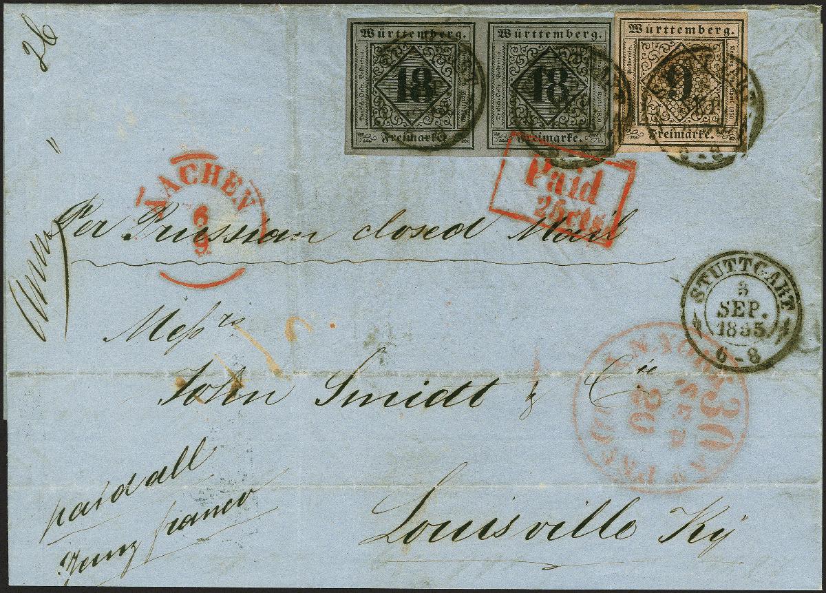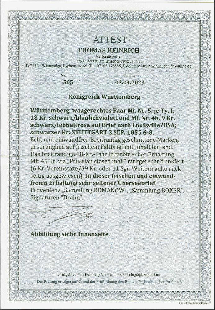 | Zusatzinformationen und Suchstichworte: | 382. Auktion Heinrich Köhler 18. – 23. September 2023 Los 334 18 Kreuzer schwarz auf bläulichviolett, Type I, waagerechtes Paar, zusammen mit 9 Kreuzer schwarz auf lebhaftrosa, alle farbfrisch und breitrandig geschnitten, mit sauber auf- und nebengesetztem Doppelkreisstempel "STUTTGART 3 SEP. 1855" auf komplettem Faltbrief über die 'Prussian closed mail' nach Louisville, Kentucky, portogerecht frankiert mit 6 Kreuzern Vereinsporto und 39 Kreuzern Weiterfranko (rückseitig notiert). Sehr schöne frische und einwandfreie Erhaltung. Ein attraktiver Transatlantik-Brief der 1. Ausgabe. Fotoattest Heinrich BPP (2023) Ausruf 2.000,00 EUR |