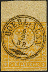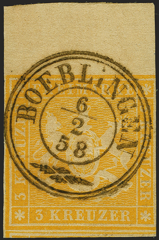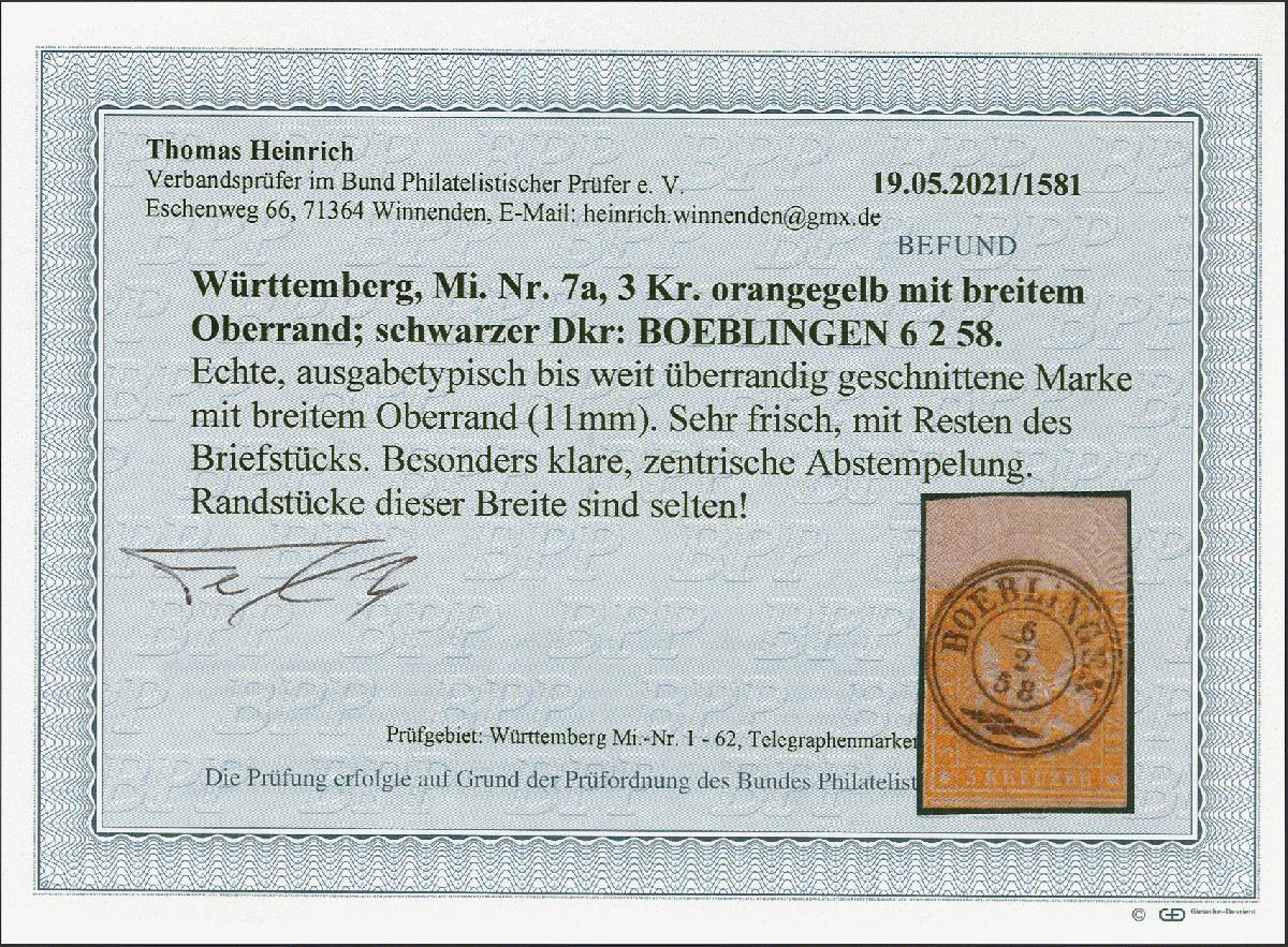 | Zusatzinformationen und Suchstichworte: | 382. Auktion Heinrich Köhler 18. – 23. September 2023 Los 335 1857,3 Kreuzer orangegelb, ausgabetypisch bis überrandig geschnitten, unten mit Teil der Nachbarmarke, oben mit ca. 11 mm Bogenrand, sehr schön entwertet durch klar aufgesetzten Einkreisstempel "BOEBLINGEN 6/2 58". Rückseitig Reste des Briefstückes, ein Ausnahmestück in sonst einwandfreier Erhaltung. Fotobefund Heinrich BPP (2021) Ausruf 150,00 EUR |