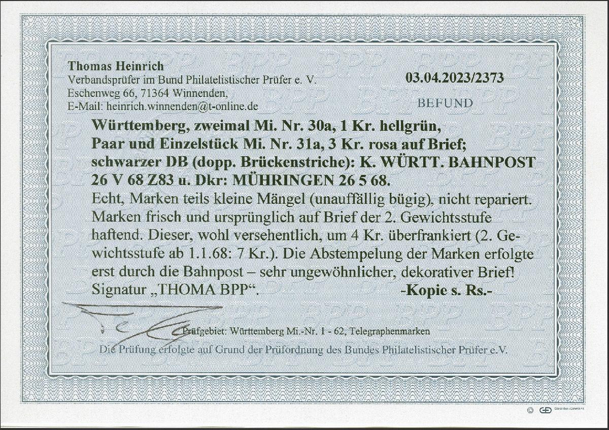 | Prüfer: | Heinrich, Thomas (BPP (Bund Philatelistischer Prüfer)) |