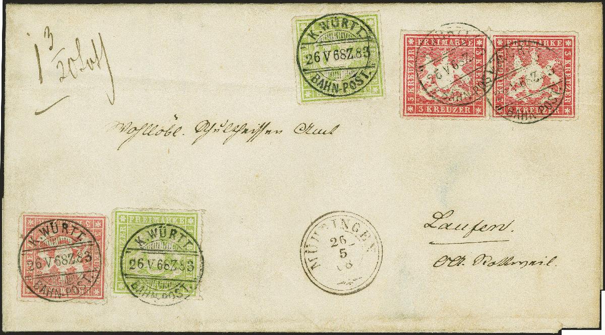 | Zusatzinformationen und Suchstichworte: | 382. Auktion Heinrich Köhler 18. – 23. September 2023 Los 338 1865, 1 Kreuzer hellgrün, 2 Einzelwerte, zusammen mit Paar und Einzelstück 3 Kreuzer rosa, alle farbfrisch und gut durchstochen, mit einzelnen sauber aufgesetztem Stempel "K. WÜRTT. BAHN-POST 26 V 68 Z 83" auf komplettem Faltbrief der 2. Gewichtsstufe, mit nebengesetztem Aufgabestempel "MÜHRINGEN 26 5 68" nach Laufen. Die oberen Werte unauffällig bügig, sonst gute und besonders attraktive Erhaltung. Der Brief ist ungewöhnlicherweise um 4 Kreuzer überfrankiert. Ein ungewöhnliches Stück. Signiert Thoma BPP und Fotobefund Heinrich BPP (2023) Ausruf 100,00 EUR |