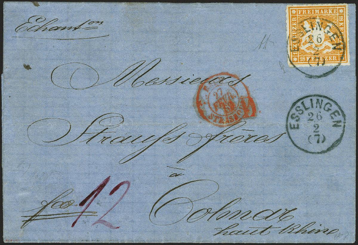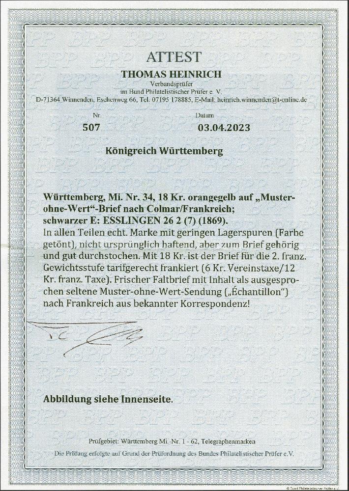| Zusatzinformationen und Suchstichworte: | 382. Auktion Heinrich Köhler 18. – 23. September 2023 Los 339 18 Kreuzer orangegelb, minimal getönt, sonst farbfrisch und gut durchstochen, mit sauber auf- und nebengesetztem Einkreisstempel "ESSLINGEN 26 2" (1869) auf komplettem Faltbrief der 1. deutschen und 2. französischen Gewichtsstufe, als 'Muster ohne Wert' ("Echant.on") nach Colmar in Frankreich. 12 Kreuzer Weiterfranko vorderseitig ausgewiesen. Die Marke war zur Kontrolle gelöst. Schöne und sonst einwandfreie Erhaltung. Fotoattest Heinrich BPP (2023) Ausruf 500,00 EUR |