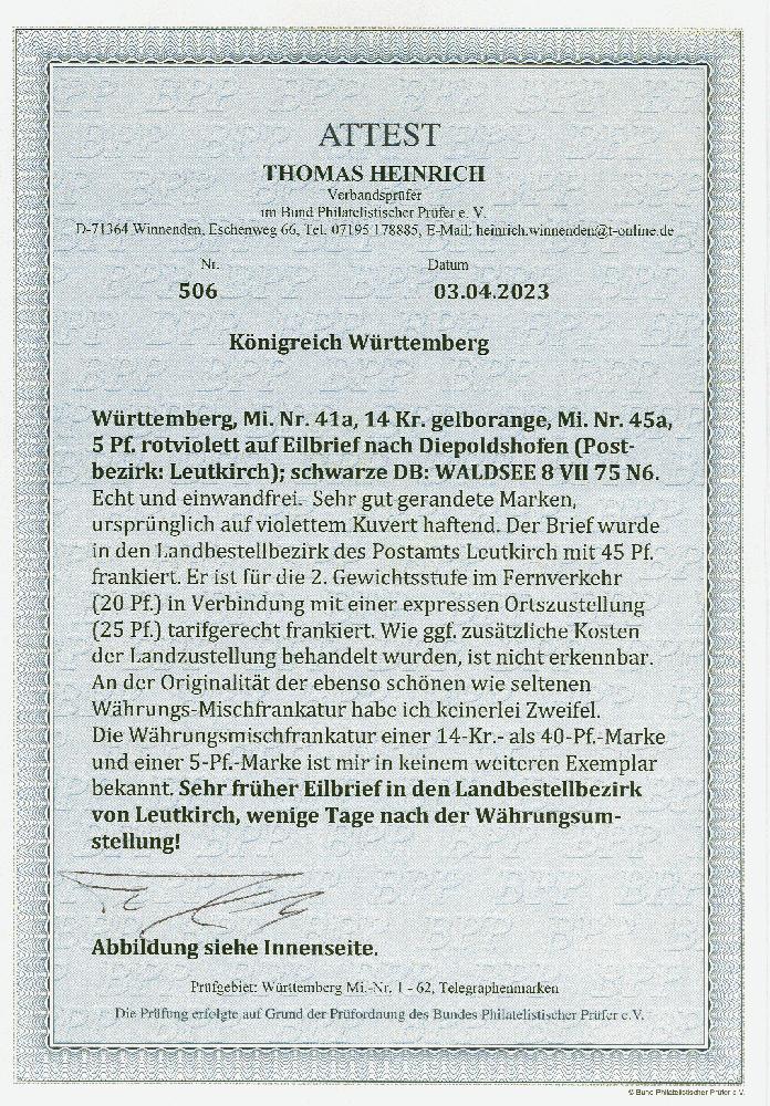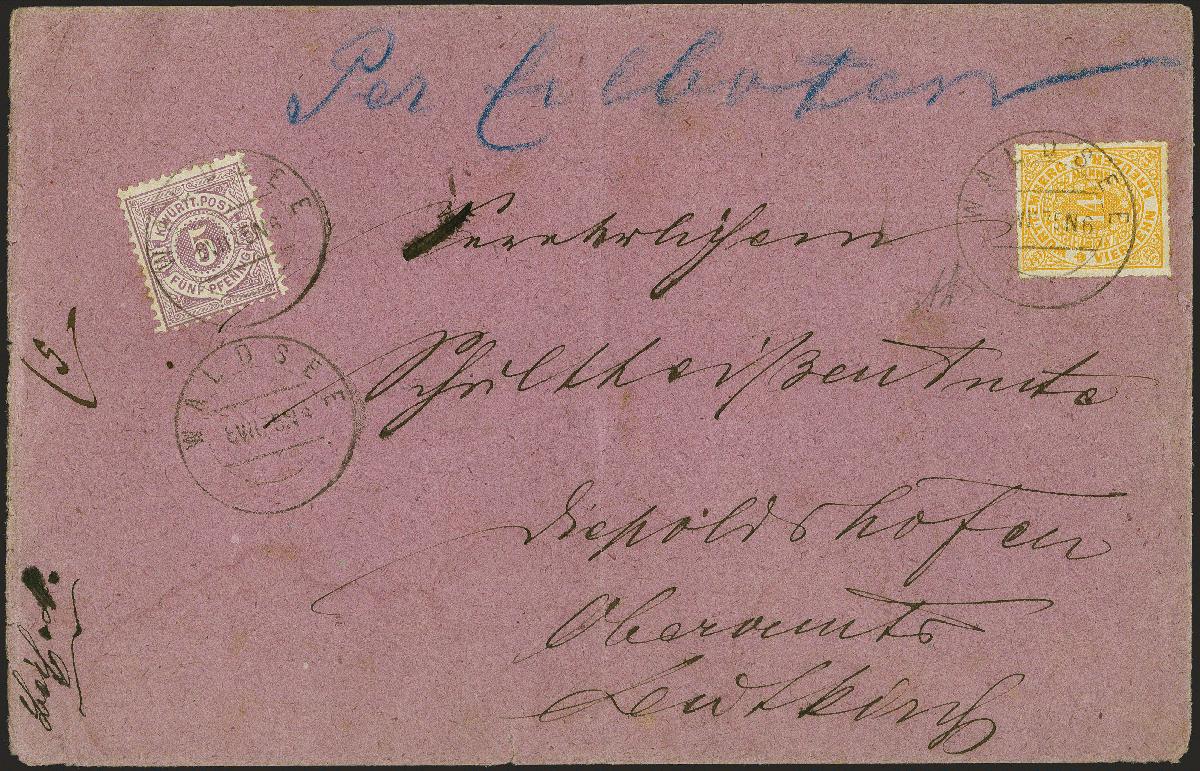 | Zusatzinformationen und Suchstichworte: | 382. Auktion Heinrich Köhler 18. – 23. September 2023 Los 340 Ovalausgabe 14 Kreuzer gelborange, in Mischfrankatur mit 1875, 5 Pfennig rotviolett, beide farbfrisch und gut durchstochen bzw. gezähnt, mit sauber auf- und nebengesetztem Brückenstempel "WALDSEE 8 VII 75", auf violettem Briefkuvert der 2. Gewichtsstufe mit Vermerk "Per Eilboten" nach Diepoldshofen im Postbezirk von Leutkirch, mit rückseitigem Ankunftsstempel. Das Porto entspricht dem einer Briefsendung der 2.Gewichtsstufe mit einer Expressen Ortszustellung; die Behandlung bezüglich der Landzustellung ist nicht erkennbar. In jedem Fall eine einmalige und attraktive Mischfrankatur. Signiert Alberto Diena, Fotoattest Heinrich BPP (2023) Ausruf 2.000,00 EUR |