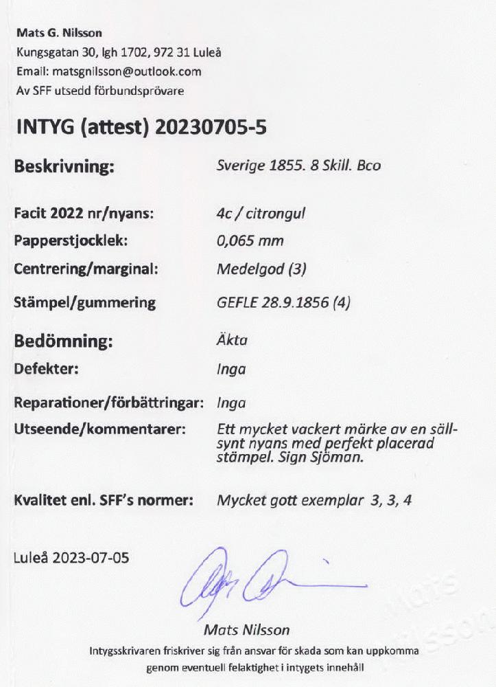 | Zusatzinformationen und Suchstichworte: | Postiljonen 239. Int. Briefmarken Auktion 26. - 29. September 2023 Los 1210 Schweden Skilling Banco A perfectly placed "GEFLE 28.9 1856" on 8 Sk. Bco in the rare shade lemon yellow. Cert. Mats Nilsson. VERY FINE. Ausruf 1.000,00 EUR |