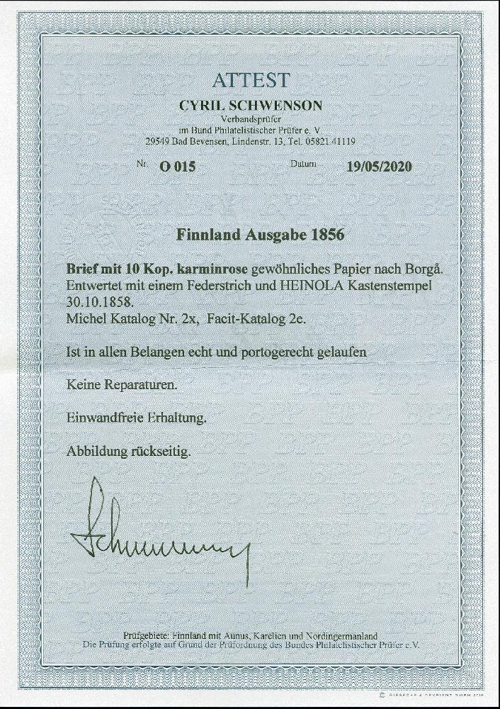 | Zusatzinformationen und Suchstichworte: | 382. Auktion Heinrich Köhler 18. – 23. September 2023 Los 1019 10k. carmine-rose, fresh color and close to large margins all around, tied by boxed "HEINOLA 30 10 1858" and manuscript to folded letter to Borga with arrival mark, a fine and attractive entire, certificates Ossa (1978) and Schwenson BPP (2020) Ausruf 300,00 EUR |