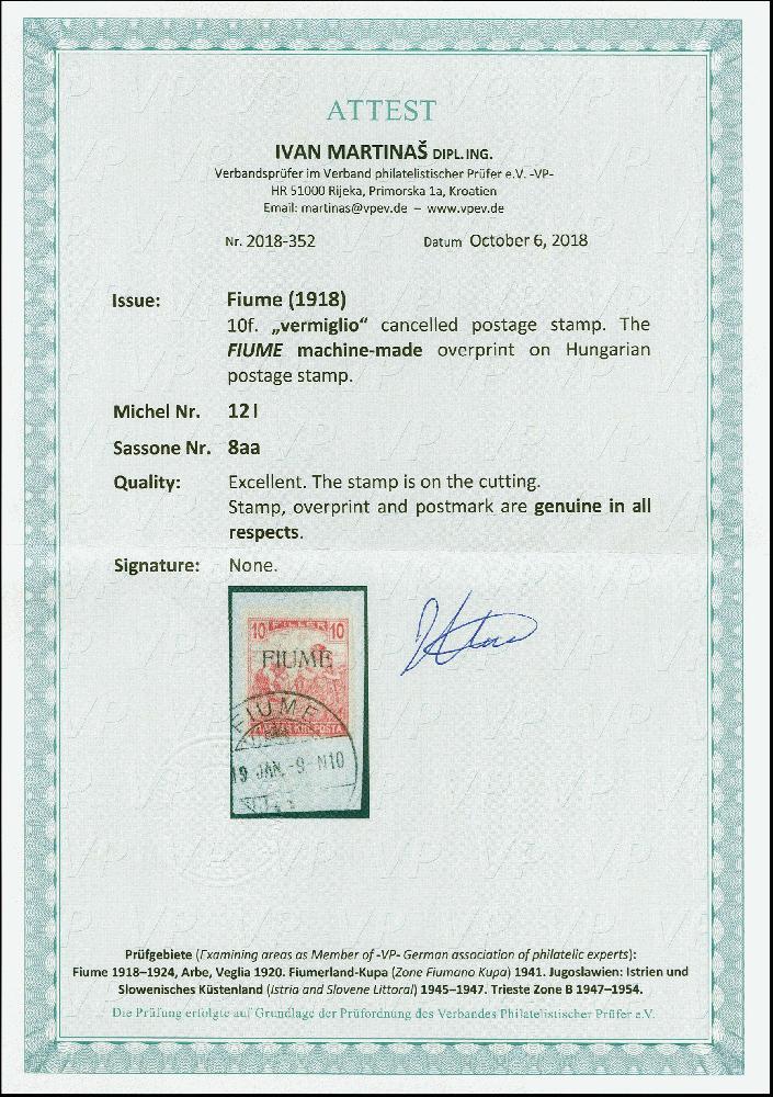 | Zusatzinformationen und Suchstichworte: | 382. Auktion Heinrich Köhler 18. – 23. September 2023 Los 1020 1918, Reaper 10f. with handstamped overprint, fresh color and good perforation, tied by cds. "FIUME 19 HAN -9 -N10" to small piece, fine exmaple of this rare stamp, certificate Martinas (2018) Ausruf 800,00 EUR |