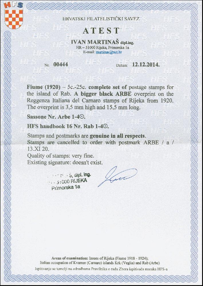 | Zusatzinformationen und Suchstichworte: | 382. Auktion Heinrich Köhler 18. – 23. September 2023 Los 1024 1920, Arbe 5-25c. with large figure overprint, used with clear cds. "ARBE 13.XI.20", fine, certificate Martinas (2014) Ausruf 100,00 EUR |
