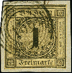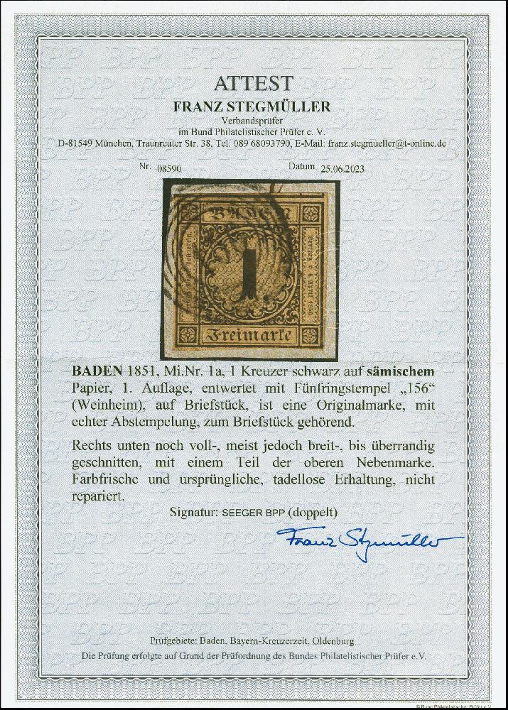 | Zusatzinformationen und Suchstichworte: | 382. Auktion Heinrich Köhler 18. – 23. September 2023 Los 3693 1 Kr. auf sämisch, farbfrisch, unten noch voll- meist jedoch breit- bis überrandig geschnitten, mit einem Teil der oberen Nachbarmarke, sauber mit Nummernstempel "156" Weinheim auf Briefstück, tadellos, sign. Seeger BPP sowie Fotoattest Stegmüller BPP (2023) Ausruf 200,00 EUR |