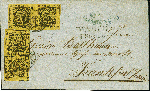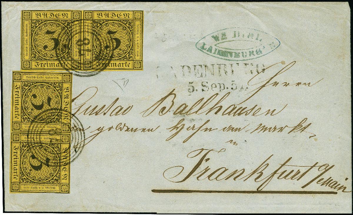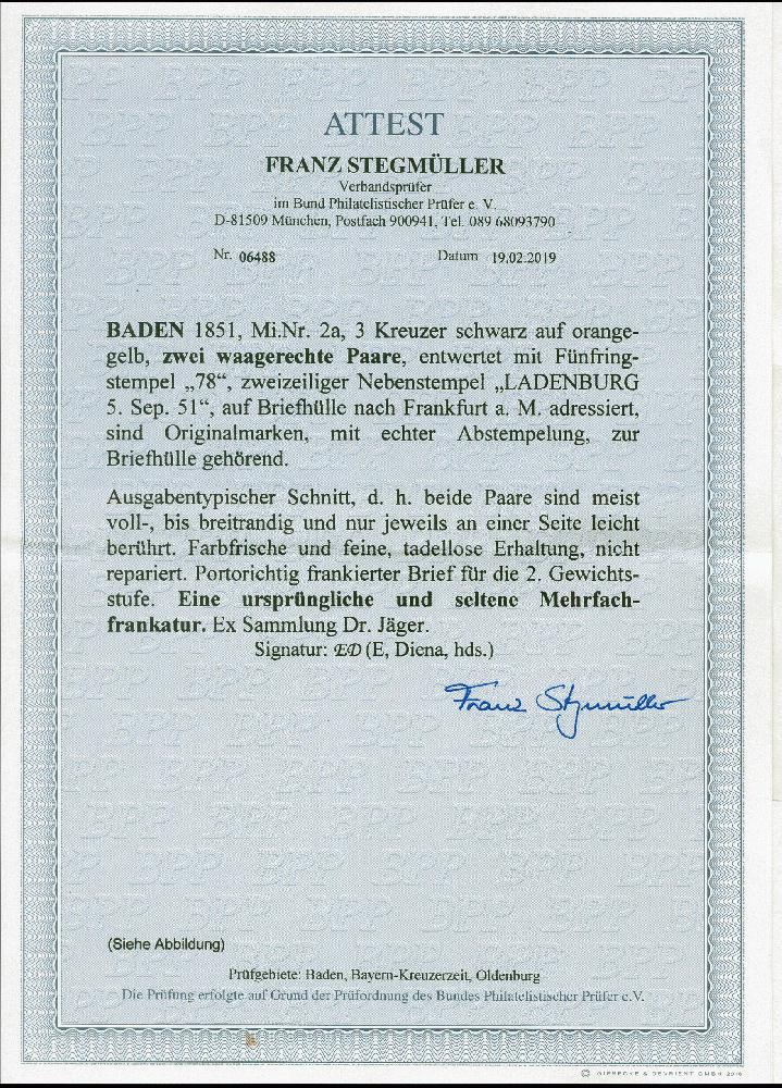 | Zusatzinformationen und Suchstichworte: | 382. Auktion Heinrich Köhler 18. – 23. September 2023 Los 3695 1851, 3 Kreuzer schwarz auf lebhaftrötlichgelb (orangegelb), zwei sehr farbfrische waagerechte Paare in insgesamt überdurchschnittlichem Schnitt, mit paarweise sehr klar aufgesetzten Nummernstempeln "78" auf vollständiger Faltbriefhülle mit Aufgabe-L2 "LADENBURG 5. Sep. 51" nach Frankfurt am Main. Eine ganz ursprüngliche und sehr seltene hohe Mehrfachfrankatur. Signatur und Fotoattest Diena, Fotoattest Stegmüller BPP. Ausruf 1.000,00 EUR |