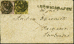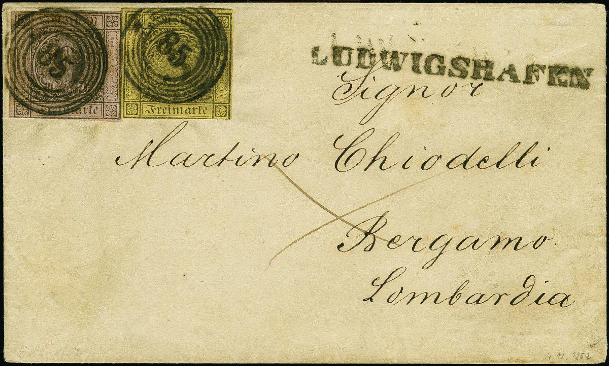 | Zusatzinformationen und Suchstichworte: | 382. Auktion Heinrich Köhler 18. – 23. September 2023 Los 3697 9 Kr. auf lilarosa und 3 Kr. auf gelb, beide in üblichem Schnitt, meist voll- bis überrandig, mit klarer Nr. "85" und nebengesetztem L1 "LUDWIGSHAFEN" auf Briefhülle vom Dezember 1852 nach Bergamo in der Lombardei. Korrektes Porto für einen einfachen Brief über die Schweiz; dieser Leitweg war seit dem 15.10.1852 zugelassen. Fotoattest Stegmüller BPP (2010) Ausruf 200,00 EUR |