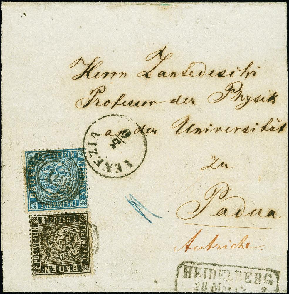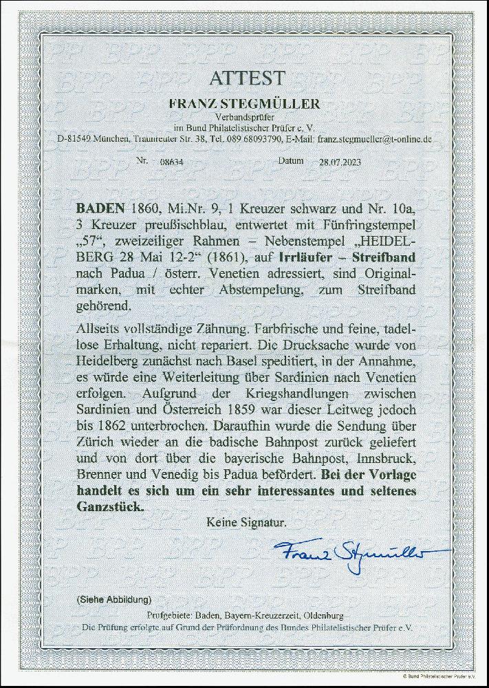 | Zusatzinformationen und Suchstichworte: | 382. Auktion Heinrich Köhler 18. – 23. September 2023 Los 3699 1860,1 Kreuzer schwarz und 3 Kreuzer preußischblau, farbfrisch und gut gezähnt, mit Nr. 57 und nebengesetztem Ra.2 "Heidelberg 28 Mai (1861) auf Streifband nach Padua, Venetien. Die Drucksache wurde zunächst für den Transport über die Schweiz nach Basel befördert, aufgrund der Kriegshandlungen zwischen Sardinien und Österreich war dieser Leitweg jedoch bis 1862 unterbrochen, daher wurde die Sendung über Zürich wieder an die badische Bahnpost zurückgeliefert und von dort über die bayerische Bahnpost, Innsbruck Brenner und Venedig nach Padua befördert; alle entsprechenden Transitstempel rück- und vorderseitig. Ein postgeschichtlich hochinteressantes und seltenes Stück in sehr schöner Erhaltung. Fotoattest Stegmüller BPP (2023) Ausruf 1.000,00 EUR |