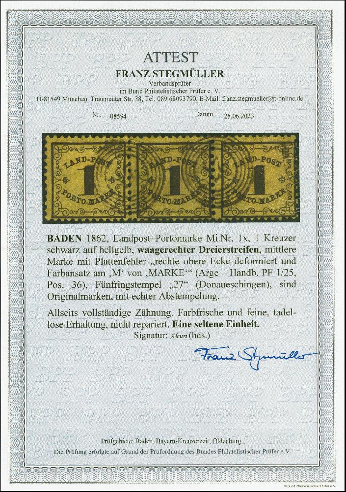 | Prüfgebiet: | Altdeutschland Baden Landpost-Portomarken |